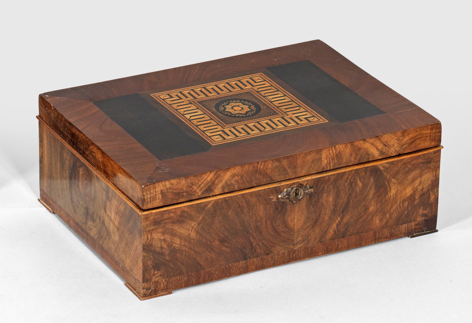 Mahagoni, furniert sowie aus teilw. grün gefärbten Edelhölzern. Querrechteckig angelegter Korpus. Entsprechender Flachdeckel mit geometrisiertem Intarsiendekor. Innen Facheinteilung. H. 12,5 cm. 34,5 cm x 23,5 cm.