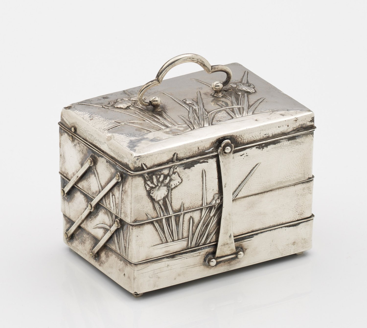 Silber, Holz. Hochrechteckiges mit durch seitliche Scharniere stufenähnlich auseinanderziehbares Kästchen. Die Wandung mit reliefplastischem Irisdekor verziert. Gest., Beschauzeichen, Herstellerzeichen. H. 8 cm. 10 cm x 7 cm.