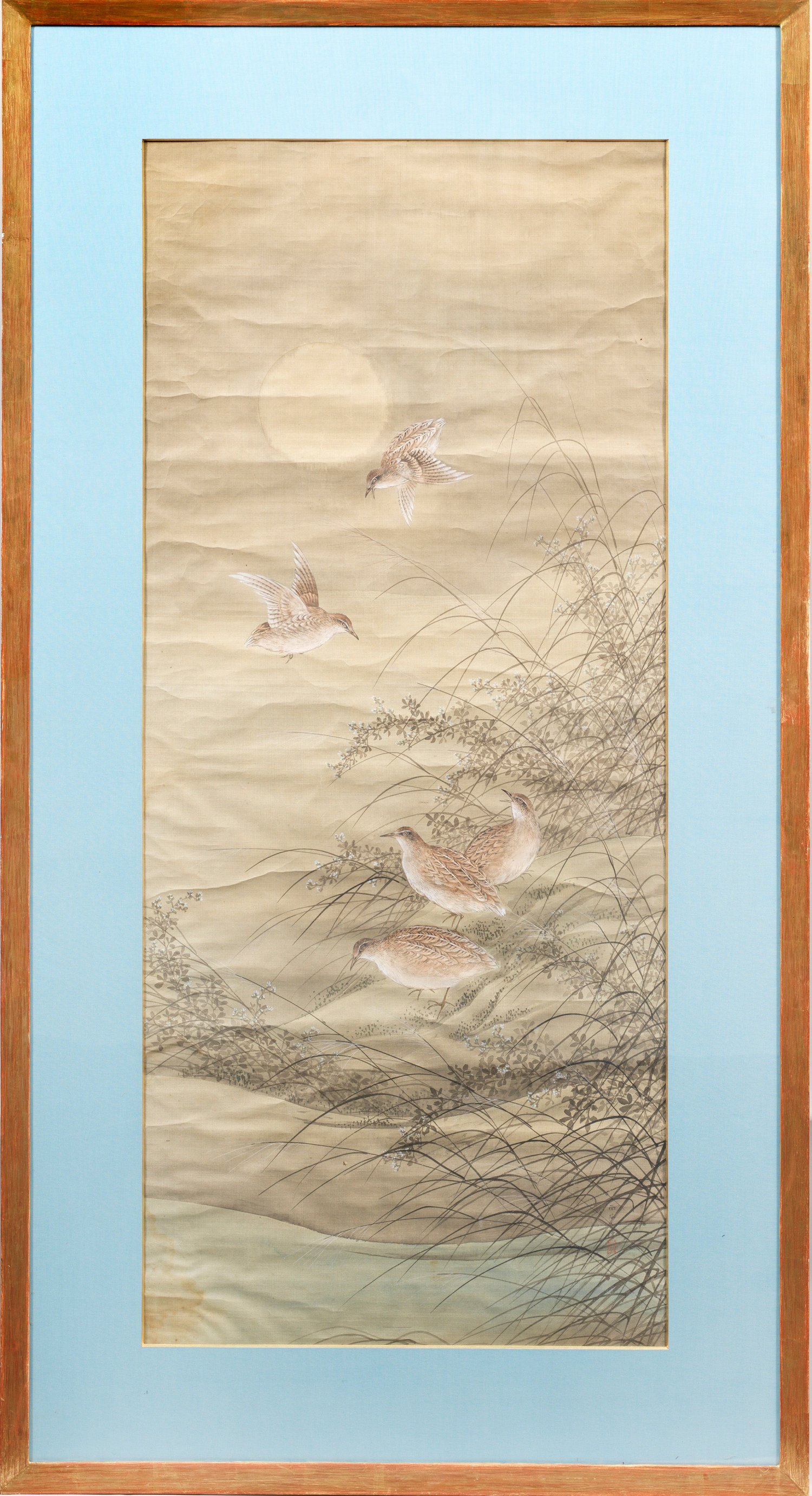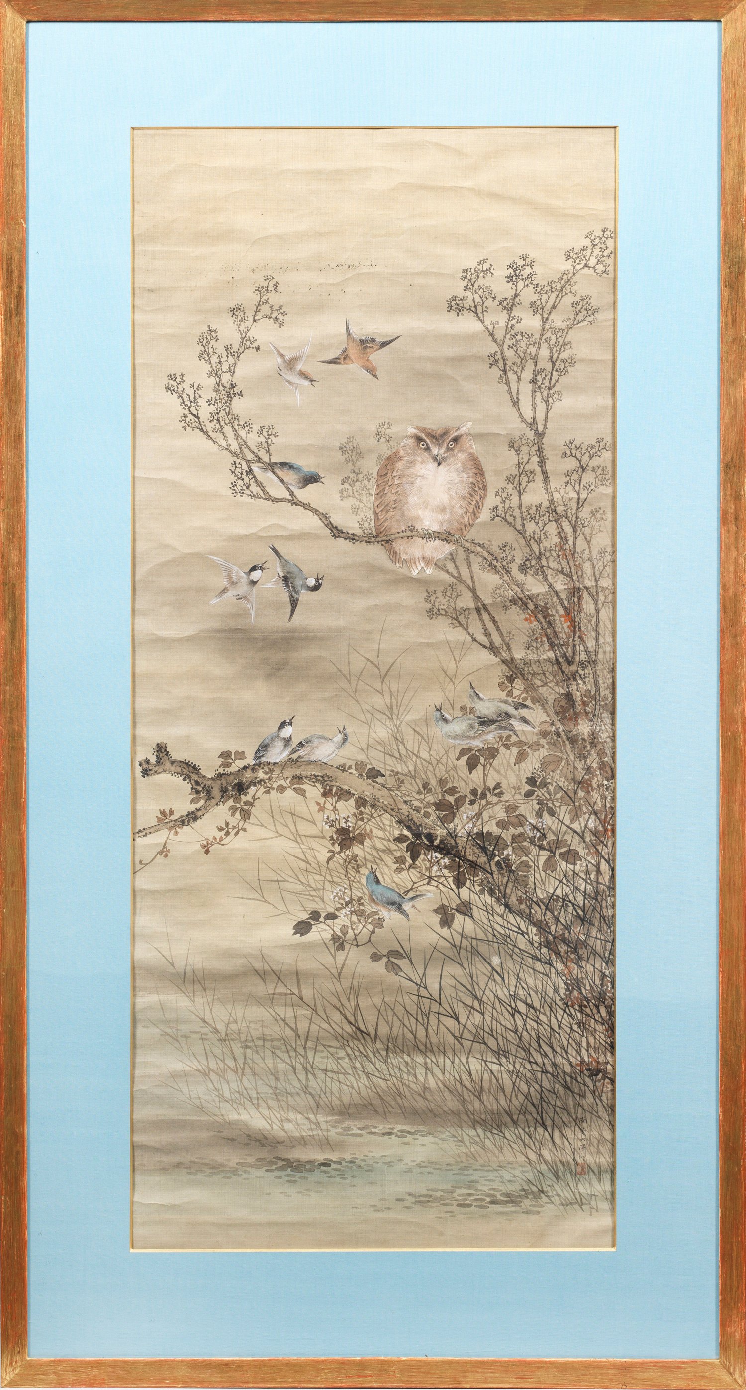 Angedeuteter Flusslauf mit Gräsern und Rebhühnern bzw. Schilfblatt, Zweigen, großer Eule und unterschiedlichen Vogelpaaren als farbige Tuschmalerei auf Papier. Rahmen. 154 cm x 84 cm. Passepartoutausschnitt 123 cm x 54 cm.