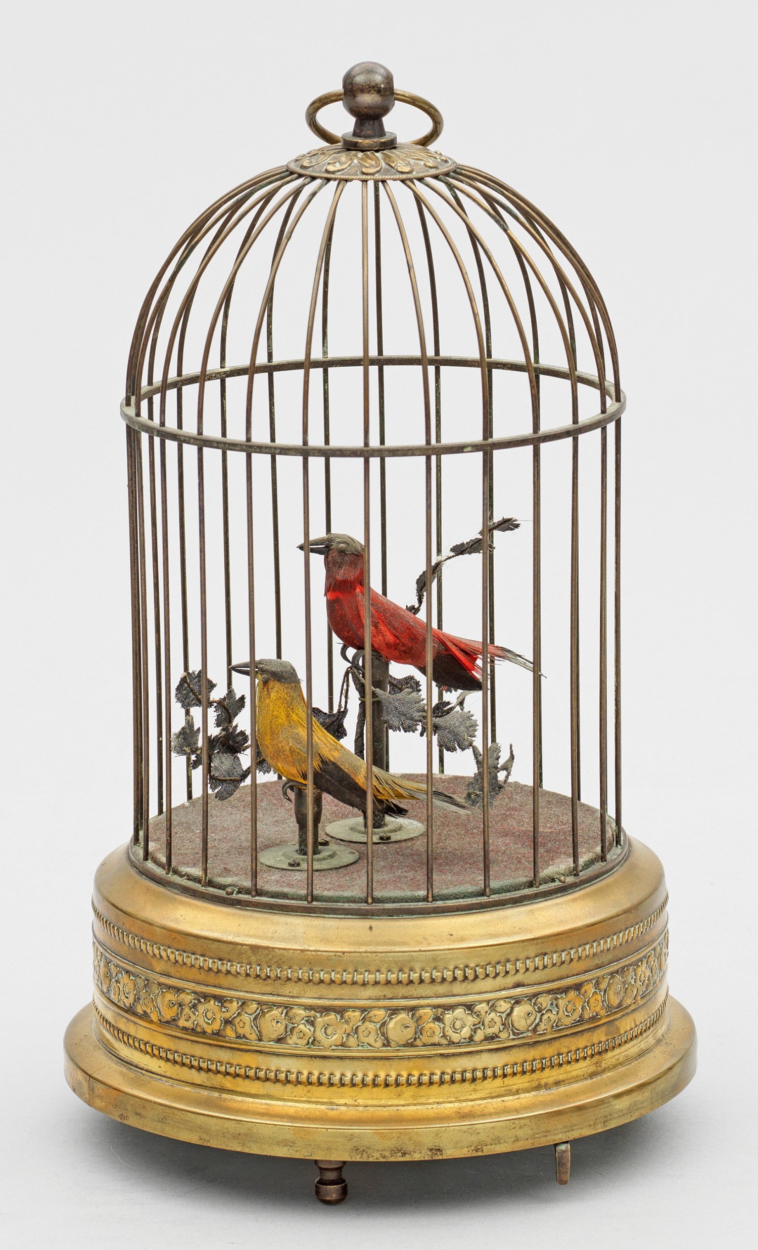 Messing, Metall und kolorierte Federn. Gerundeter Käfig aus schmalen Gitterstäben auf profiliertem Rundsockel mit umlaufendem Blütenfries. Innen reduziert angelegte Zweige sowie zwei im Wechsel singende Vogelfiguren mit beweglichen Schnäbeln. Uhrwerkaufzug. H. 28 cm.