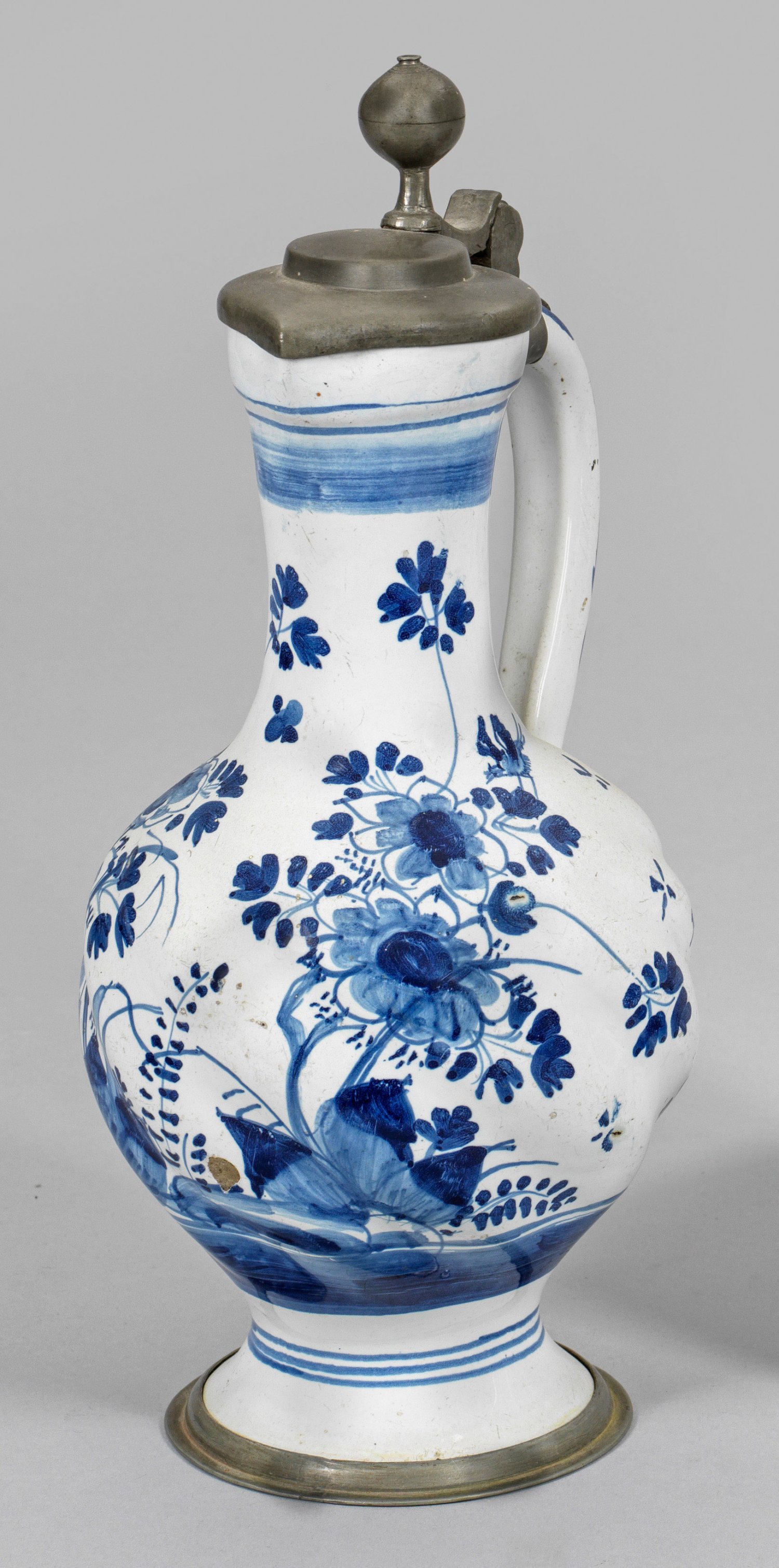 A Hanau pewter-mounted blue and white faience pitcher. Minor chips and a short hairline-crack to the rim.
