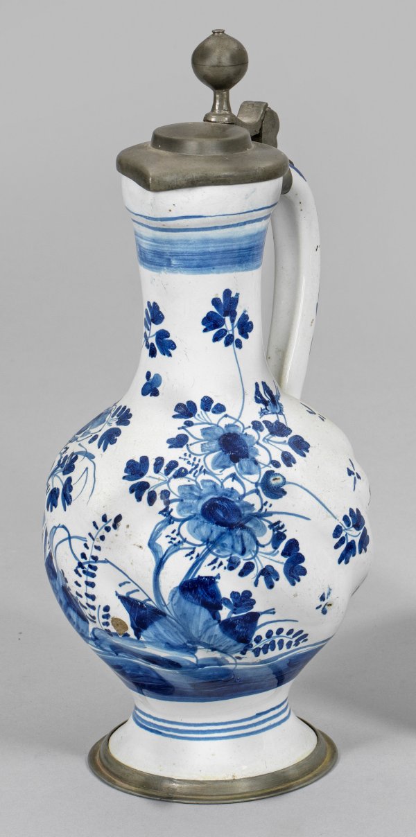 Fayence. Schräg gerippter Korpus. Kobaltblauer Scharffeuerdekor aus floralen Motiven auf einem Landschaftssockel. Ger. best. und kurzer Haarriss am Lippenrand. Zinnmontierung, der Deckel mit Kugeldrücker. H. 31,5 cm.