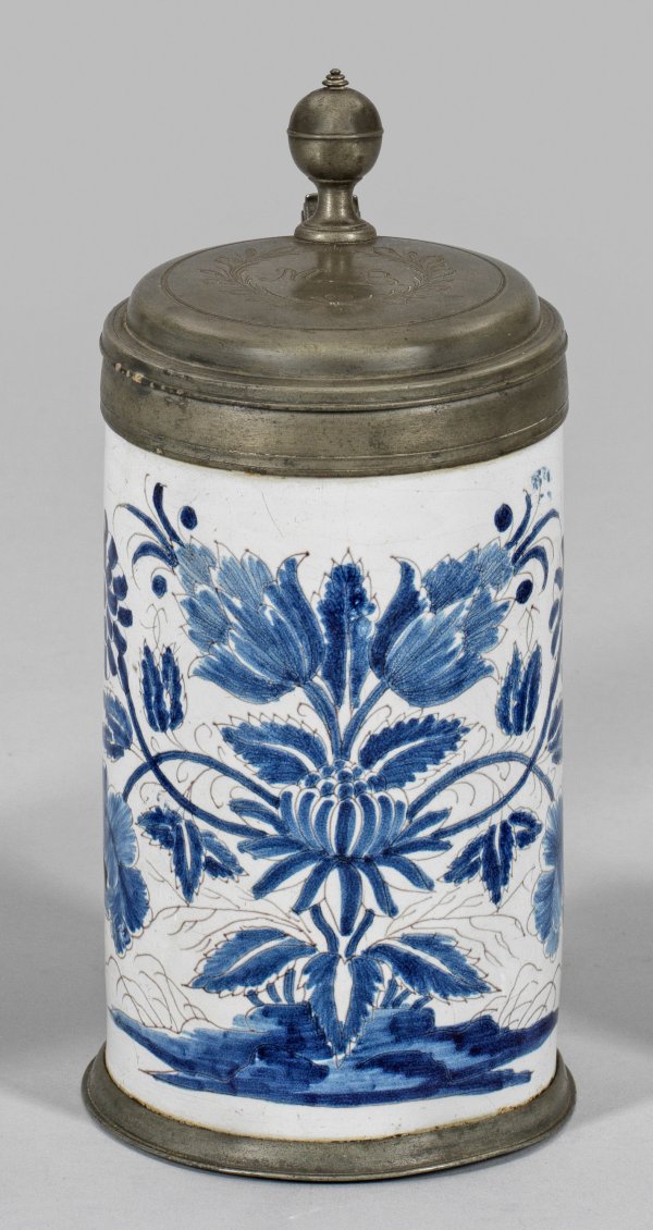 Fayence. Dekor in abgestufter kobaltblauer Scharffeuermalerei und dunkelkobaltblauer Zeichnung aus einer großen, stilisierten Blütenstaude auf Landschaftssockel. Undeutl. Manufakturmarke. Zinnmontierter Fuß, der Zinndeckel mit graviertem Monogramm umrahmt von Zweigen. H. 24,5 cm.