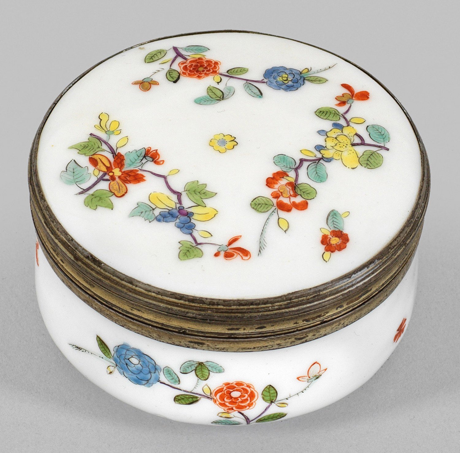 Runder Korpus mit abnehmbarem Deckel. Allseitig feiner Kakiemondekor aus Indianischen Blütenzweigen sowie emporwachsenden Päonien- und Chrysanthemenstauden. Polychrome Malerei in Eisenrot, Emailblau, Gelb, Moos- und Seegrün und Purpur im Kakiemonstil, teilw. goldgehöht. Vergoldete Silbermontierung. Gold minim. ber.; H. 3,5 cm. D. 5,5 cm.