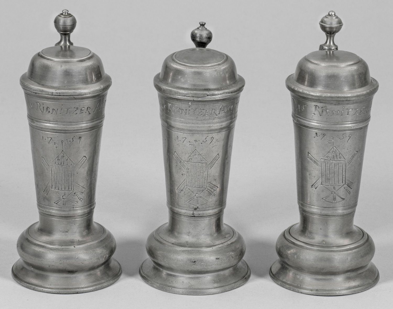 A set of three German dated and lidded pewter craft´s cups of the millers. Marked.