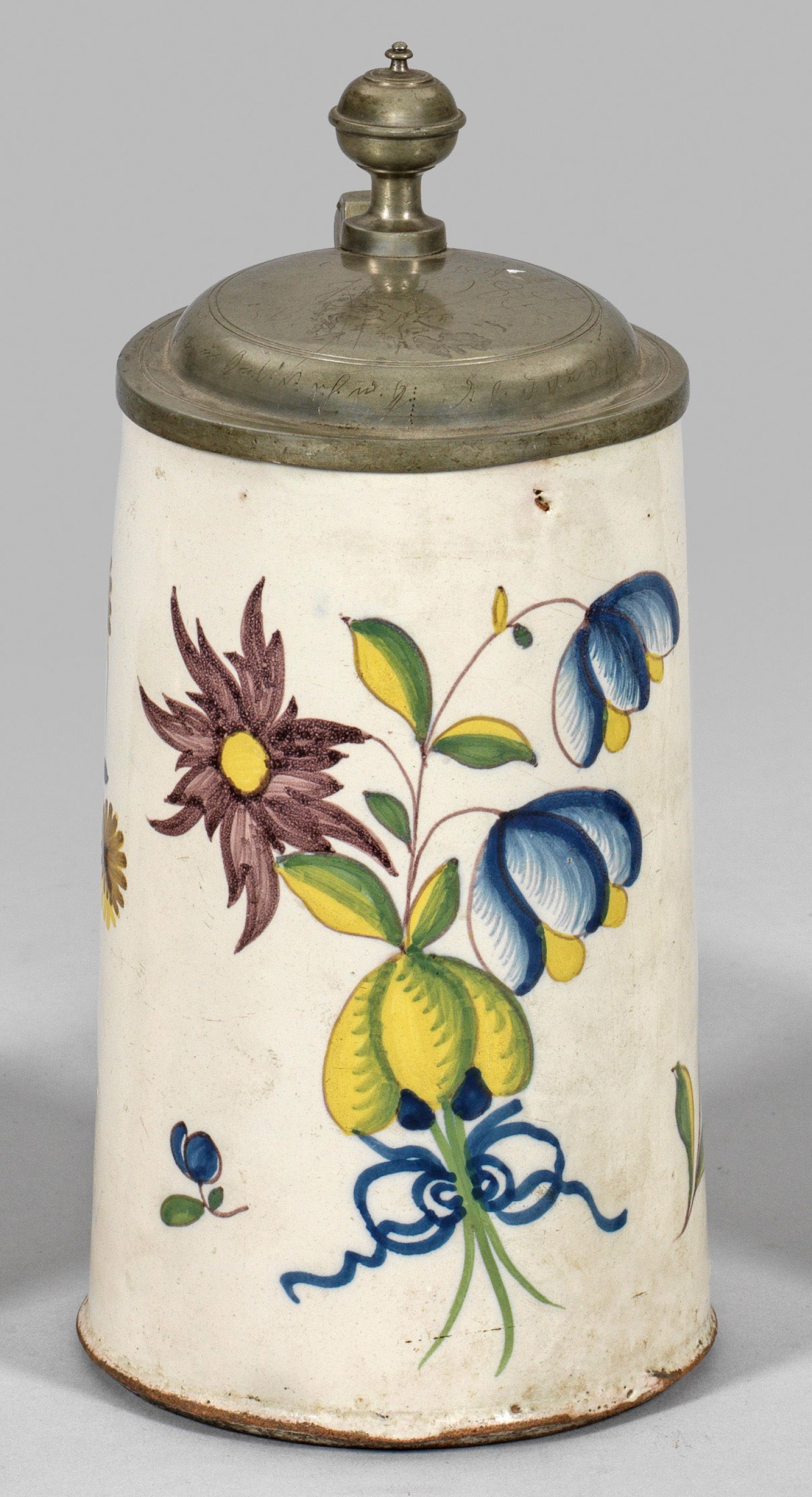 Fayence. Polychromer Scharffeuerdekor, schauseitig ein Blumenbukett, flankiert von zwei Blumenstängeln. Zinnmontierung, der Deckel mit Kugeldrücker. H. 13,5 cm.