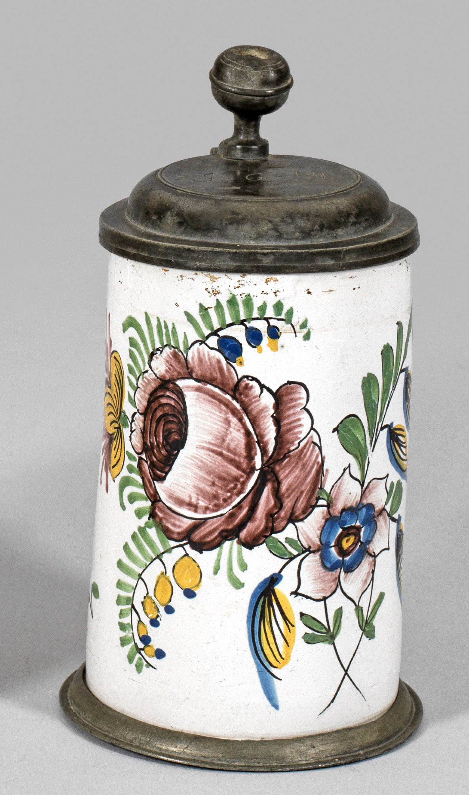 Fayence. Polychromer floraler Dekor mit Blumenbukett in Scharffeuermalerei. Zinnmontierter Fuß, der Zinndeckel mit graviertem Monogramm. Kugeldrücker besch.; H. 19,3 cm.