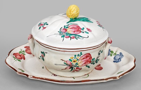 Fayence. Runde, leicht fassonierte Terrine mit zwei seitlichen, hochgezogenen Henkeln, auf dem Deckel ein plastischer Zitronenknauf. Ovale, passige Platte mit profiliertem Rand. Polychromer Dekor in Muffelmalerei aus gestreuten Blumen sowie Blumenbuketts mit Rosen und anderen Blumen. Ger. best., Unterteil der Terrine rest.; Terrine H. 19 cm, D. ca 22 cm; Platte L. 38,7 cm.