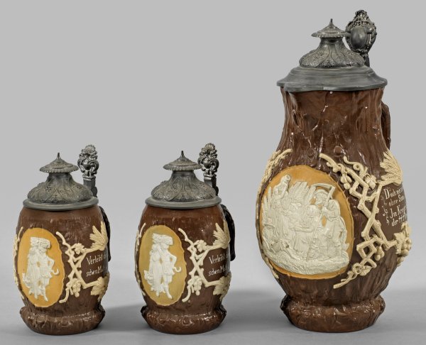 Steinzeug mit Zinndeckeln. Gebauchte Baluster- bzw. Walzenform in reliefplastischer Ast-Optik mit entsprechend gestalteten Henkeln, dunkelbraun glasiert. Aufgelegter, reicher weißgrauer Reliefdekor aus stilisiertem Wein und Getreide, schauseitig Reliefdarstellungen mit Ernte-Motiven auf hellbraunem Fond, flankierend und rücks. Trinksprüche. Modell-Nr. 1028. Firmenmarke (Merkurmarke). H. 18,2 cm-31,5 cm.