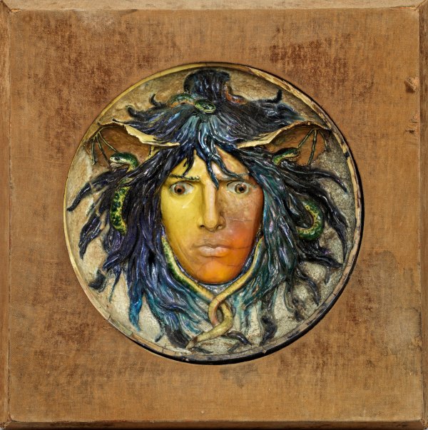 An unique ceramic relief roundel with head of Medusa by Carl ("Carlo") Kornhaas. Painted earthenware with lustre glazes. Original frame. Inscribed and signed by the artist on a label of the VII International Art Exhibition in Munich 1897.