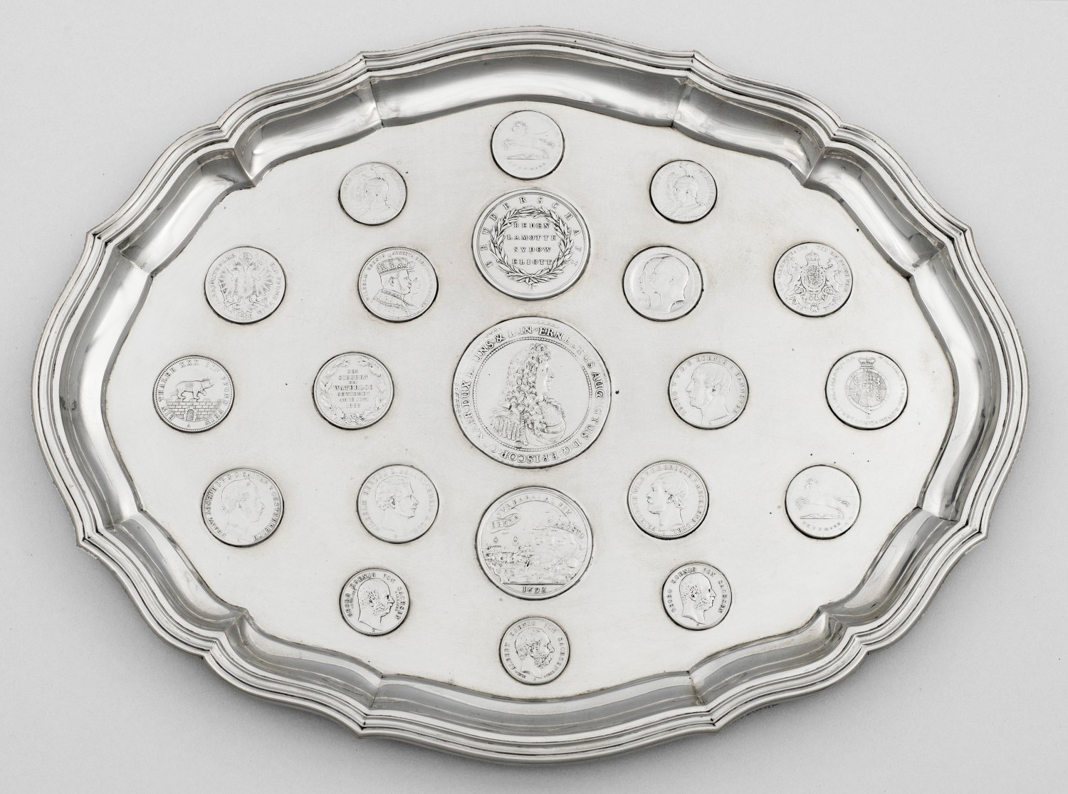 Silber. Auf vier Kugelfüßen ovaler, gering gemuldeter Spiegel, übergehend in passig geschweiften, sanft ansteigenden und mehrfach profilierten Rand. Im glatten Spiegel insges. 21 eingelassene, unterschiedliche Münzen und Medaillen von 1680 bis 1904, u.a. zwei sog. 16-Gute-Groschen-Münzen des Königreichs Hannover von 1833, ein sog. Löser zu zwei Reichstaler von 1680, Zellerfeld, des Münzmeisters Rudolph Bornemann zum Regierungsantritt Herzogs Ernst August von Hannover (1629 - 1698) als Bischof in Hannover, eine Silbermedaille von 1693, Braunschweig-Lüneburg, Calenberg-Hannover des Medailleurs Ernst Brabandt mit Porträt der Gemahlin Herzog Ernst-Augusts, Sophie von der Pfalz (1630 - 1714) sowie eine Medaille des Medailleurs Lewis Pingo, 1785, für die Unterstützung der Briten durch hannoversche Truppen bei der Verteidigung Gibraltars gegen Spanien und Frankreich von 1779 - 1783. Diese Medaille wurde insgesamt 1311-mal an hannoversche Soldaten verliehen. Gest. 800, Herstellerzeichen, Händlermarke, Auftragsnummer. Gew. ca. 1285 g. H. 2,5 cm. 41 cm x 32 cm.