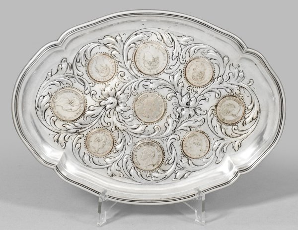 Silber. Ovale Form. Glatter, gering gemuldeter Spiegel, übergehend in blütenförmig geschweiften, mehrfach profilierten Rand. Im Spiegel üppige Akanthusblattranken, als Rahmung für insgesamt neun eingelassene Münzen des Königreichs Sachsen von 1810 bis 1870, u. a. 1/3 Taler mit Profildarstellung Friedrich Augusts, König von Sachsen und 1/6 Taler mit Darstellung König Antons von Sachsen. Gest. 800, Herstellerzeichen. Gew. ca. 295 g. 23,5 cm x 17 cm.