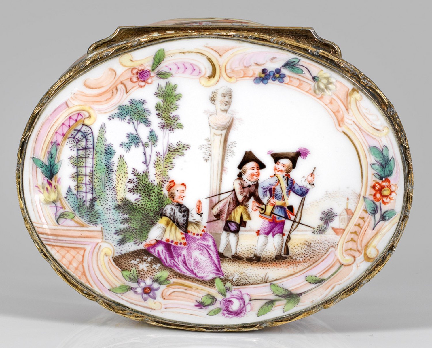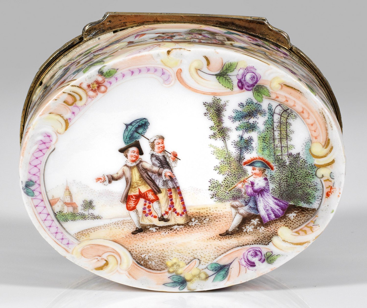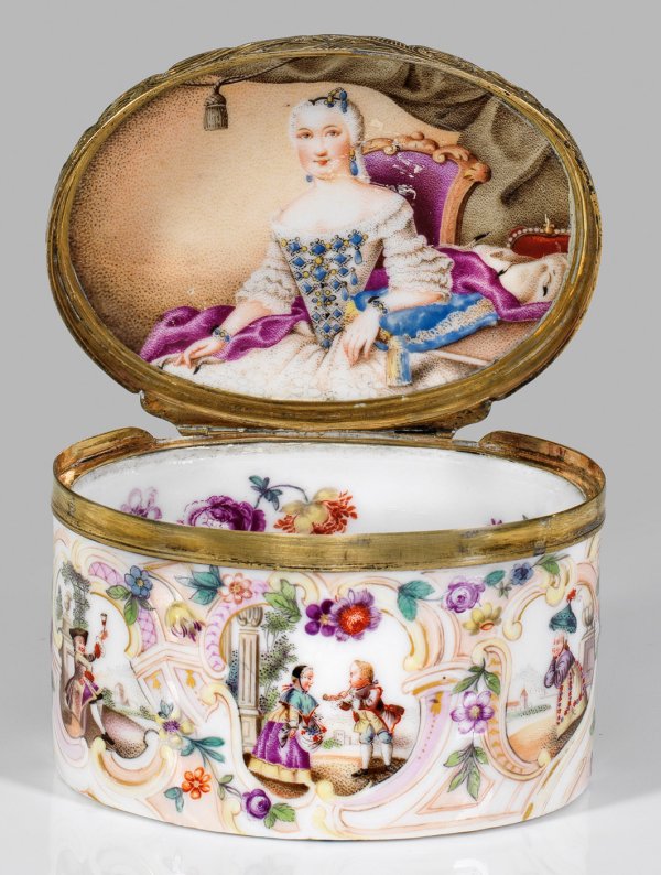 Porzellan. Ovaler, gerader Korpus mit leicht gewölbtem Scharnierdeckel. Auf der Wandung, dem Deckel und der Unterseite reliefierte, pastelltonig staffierte und von Blüten umzogene Kartusche aus Rocaillen und Bändern mit galanter, szenischer Darstellung von Kindern, als Erwachsene verkleidet. Innenwandung und -boden mit farbenprächtigem Blumendekor. Auf dem Innendeckel das Porträt einer fürstlichen Dame als Halbfigur, Maria Antonia Kurprinzessin von Sachsen (1724 - 1780), Tochter des bayerischen Kurfürsten Karl Albert aus dem Hause Wittelsbach (als Karl VII. späterer Kaiser des Heiligen Römischen Reiches) sowie Gemahlin von Friedrich Christian, Kurprinz von Sachsen. Äußerst feine polychrome Malerei in Tüpfelmanier. Floralornamentierte, vergoldete Silbermontierung. H. 5,6 cm. 8 cm x 6 cm.