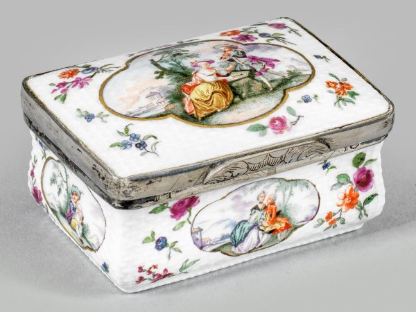 Porzellan. Rechteckiger, gebauchter Korpus sowie flach gewölbter Scharnierdeckel. Allseitiges "Ozier"-Relief mit Streublumendekor. In ausgesparten, goldkonturierten Vierpassreserven figürliche Watteauszenen, der Innendeckel mit schwebendem Boucher-Putto mit Früchtekorb. Polychrome Malerei. Innenwandvergoldung. Silbermontierung, floral gestalteter Daumengriff und Gravur "FF 13". Ber.; H. 4 cm. 7 cm x 5,5 cm.