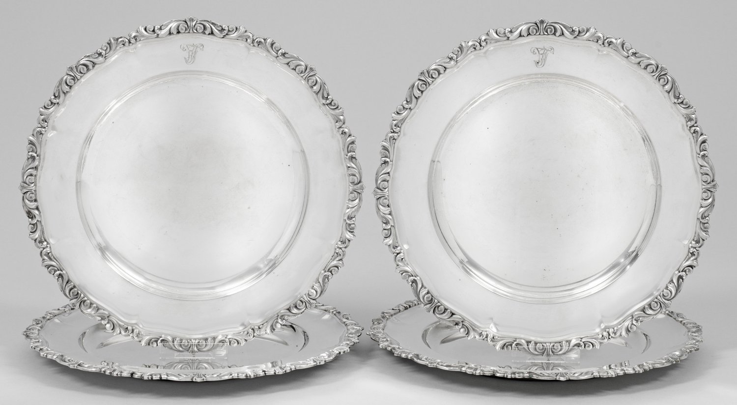 Silber. Runder, gering gemuldeter, glatter Spiegel, übergehend in gering ansteigende, blütenförmig geschweifte Fahne. Der Rand umzogen von reliefplastischem Zierband aus Akanthusblättern und Voluten. Auf der Fahne ein graviertes, ligiertes Monogramm "LA" (?). Gest. 800, Herstellerzeichen. Gew. zus. ca. 2420 g. D. 27,5 cm.