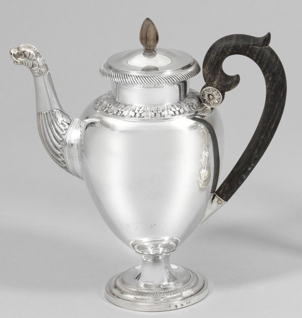 Silber. Über rundem, getrepptem Stand kurzer Schaft, übergehend in ovoiden, glatten Korpus mit gerundeter, von stilisiertem Eichenlaub umzogener Schulter. Hoch angesetzter, kurzer Ausguss in plastisch gestalteter Tülle in Form eines Delphinkopfes endend. Dunkel marmorierter Ohrenhenkel und pinienzapfenförmiger Knauf aus Holz. Gest., Beschauzeichen, Beschaumeister B. G. F. Andreack (1819 - 1842), Meister Johann Wagner und Sohn (tätig ab 1824). Gew. ca. 665 g. H. 23 cm.