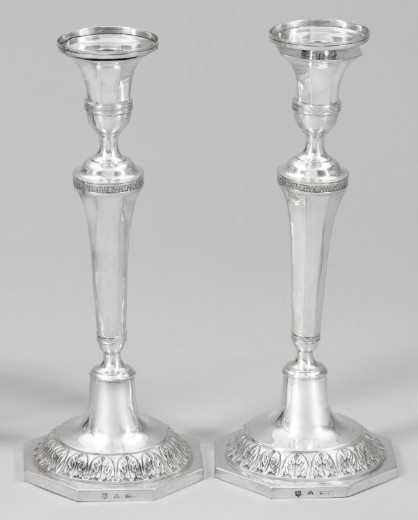 Silber. Achtfach gekanteter Stand übergehend in trompetenförmigen, von Akanthusblattfries umzogenen Fuß. Sich konisch erweiternder, korrespondierend achtfach gekanteter Schaft über eingezogener Schulter in vasenförmiger Tülle endend. Gering gemuldete, herausnehmbare Traufschale. Gest., Beschauzeichen, Meister Christian Heinrich David Schack (wird Meister 1811), Ältermannbuchstabe "A". Gew. zus. ca. 685 g. H. 30 cm.