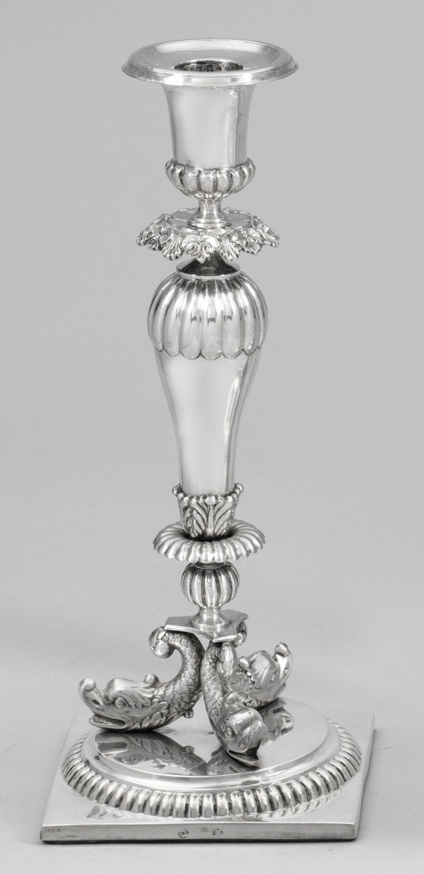Silber. Quadratische Plinthe, übergehend in aufgewölbten und mit Godronen verziertem Stand. Darüber drei vollplastisch gearbeitete Delphine als Träger für einen von ausgestellten Blatt- und Godronenkränzen gefassten konischen Schaft. Vasenförmige Tülle mit herausnehmbarer Traufschale. Auf der Plinthe graviertes Monogr. "C. G.". Rest.; Gest., Beschauzeichen, Jahresbuchstabe "Q", undeutliches Meisterzeichen "S.(?) R". Gew. ca. 810 g. H. 26,5 cm.