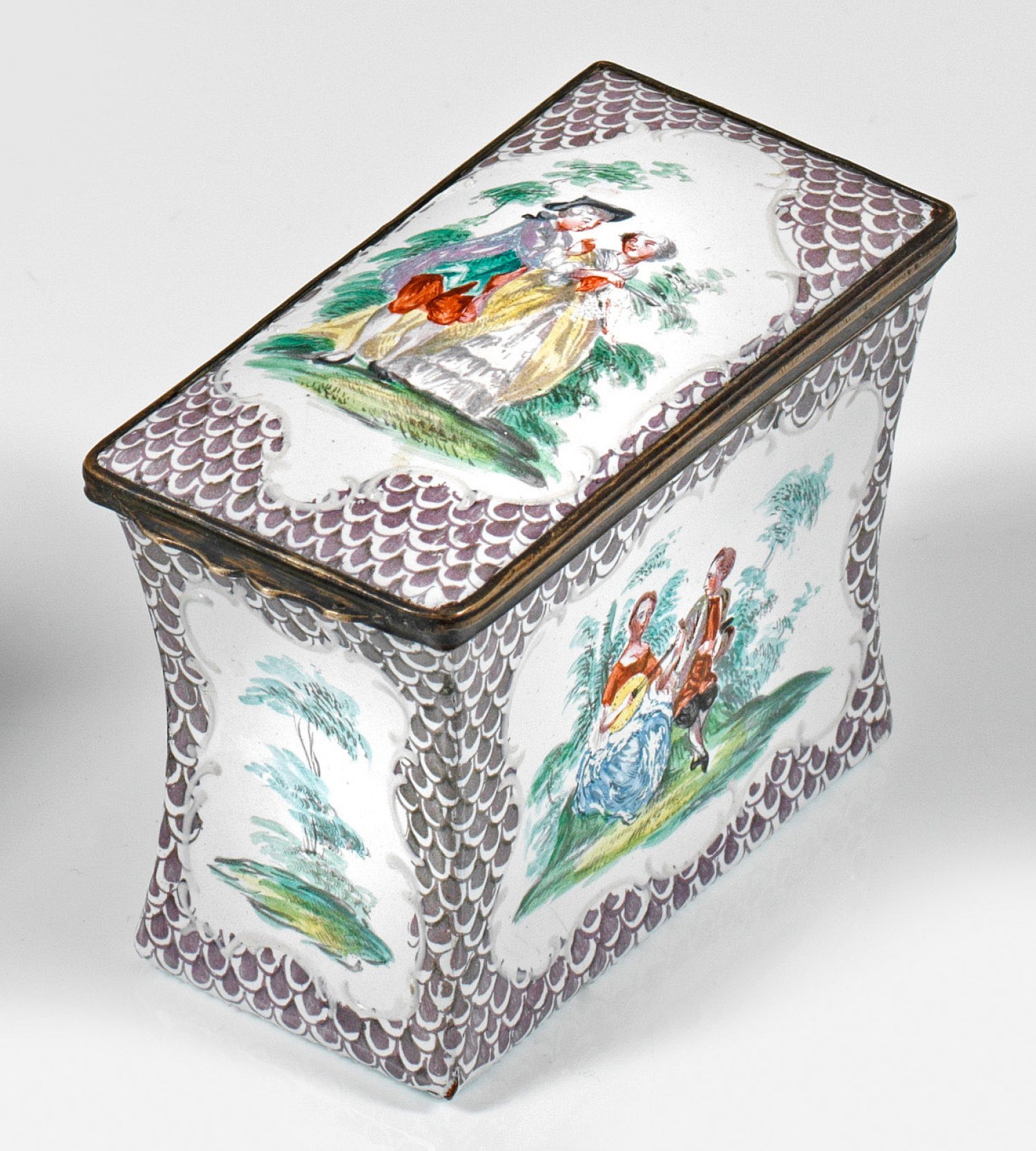 Kupfer, emailliert. Hochrechteckiger Korpus mit gering eingezogener Wandung. Scharnierter, leicht aufgewölbter Deckel. Auf Wandung und Deckel von reliefplastischen Rocaillen und Schuppenmuster gerahmte Kartuschen, mit galanten Paaren vor Parklandschaften. Passig geschweifter, schmaler Drücker. Polychrome Emaillemalerei. Minim. best.; H. 6 cm. 8,5 cm x 4 cm.