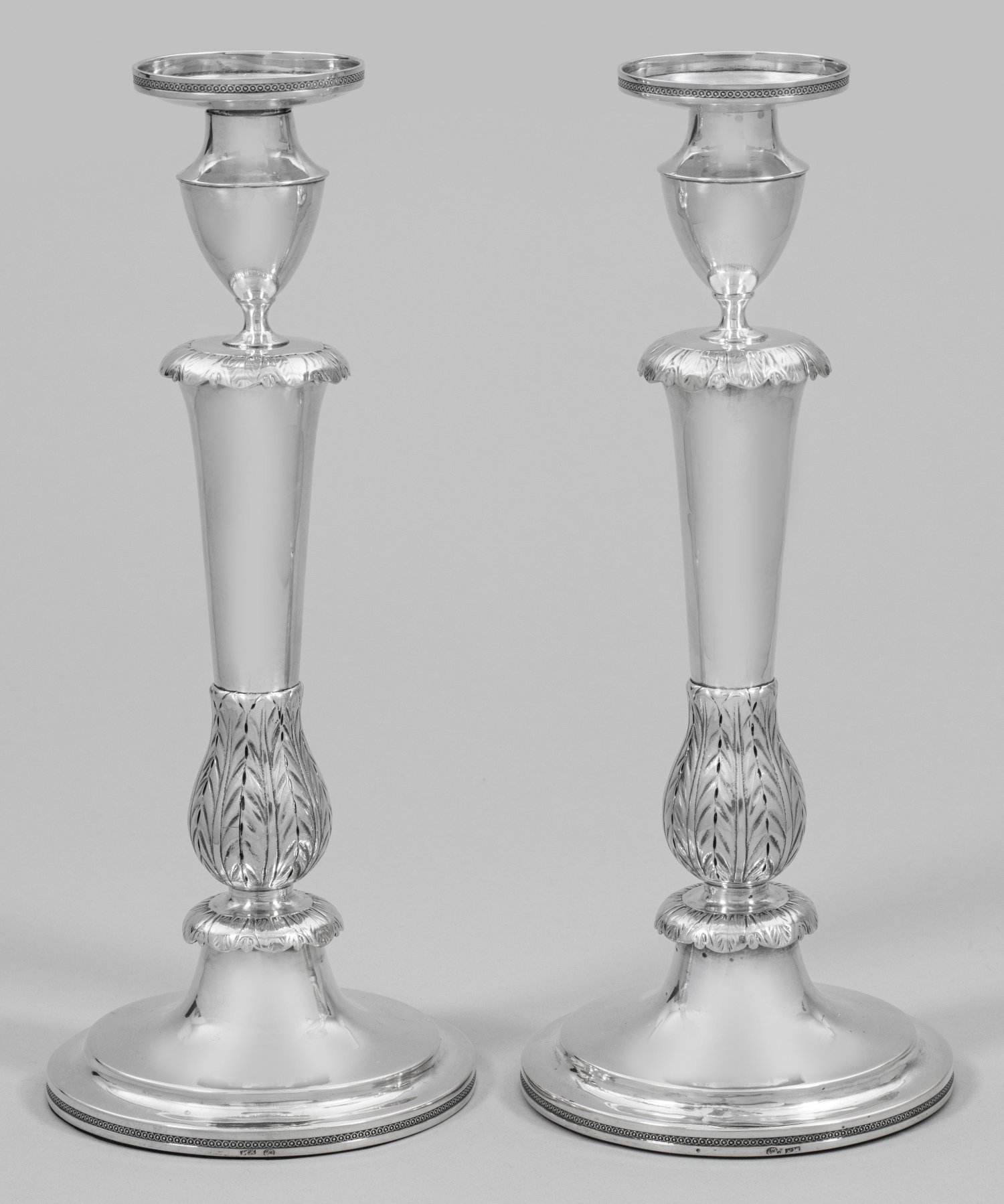 Silber. Trompetenförmiger, von graviertem Eierstabfries umzogener Stand, beschwert. Mit reliefplastisch gestalteten Lanzettblättern umzogener Nodus, übergehend in konischen Balusterschaft. An der Schulter ein ausschwingender, reliefierter Blätterkranz. Darüber eine vasenförmige Tülle mit herausnehmbarer, dem Stand entsprechend verzierter Traufschale. Eine der zwei Traufschalen verziert mit zart gravierter Darstellung eines Flötenspielers mit Tanzbären. Gest. 13 Lot, Meister Wilhelm Conrad Hessenberg (wird Meister 1799). Gew. zus. ca. 1355 g. H. 29 cm.