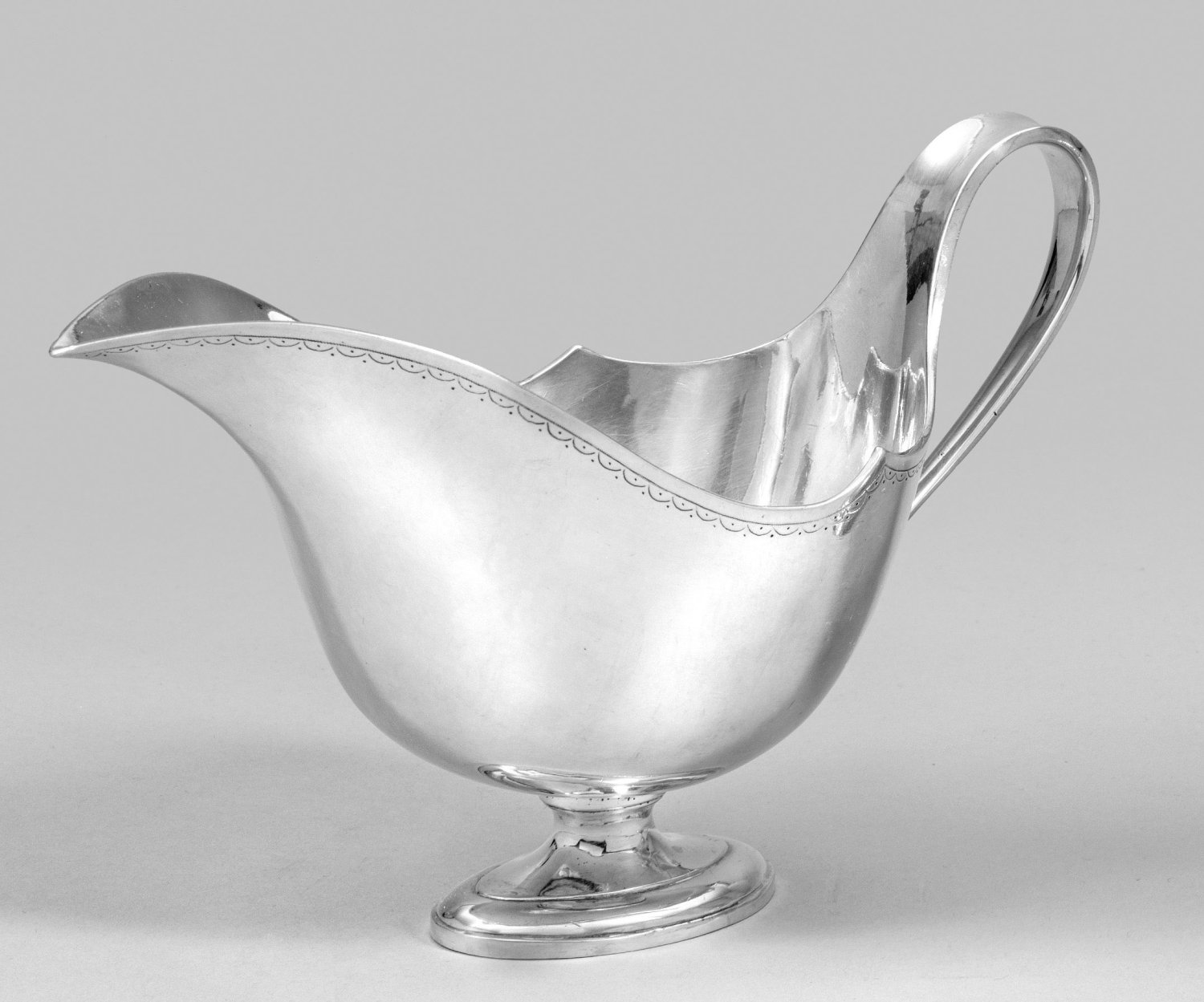 Silber. Zierlicher, mehrfach gestuft ansteigender Ovalstand mit kurzem Schaft, übergehend in tief gemuldeten, glatten Korpus. Der Rand passig geschweift und seitlich spitz zu einem Ausguss bzw. zu schmalem, gebogtem Henkel geformt. Unterhalb des Randes ein umlaufendes, zart graviertes Zierband. Am Stand monogr. "ET". Gest., Meister Pierre Collinet/Colinez (tätig seit 1770), französische Garantiemarken (1798-1838). Gew. ca. 300 g. H. 13 cm. 21,5 cm.