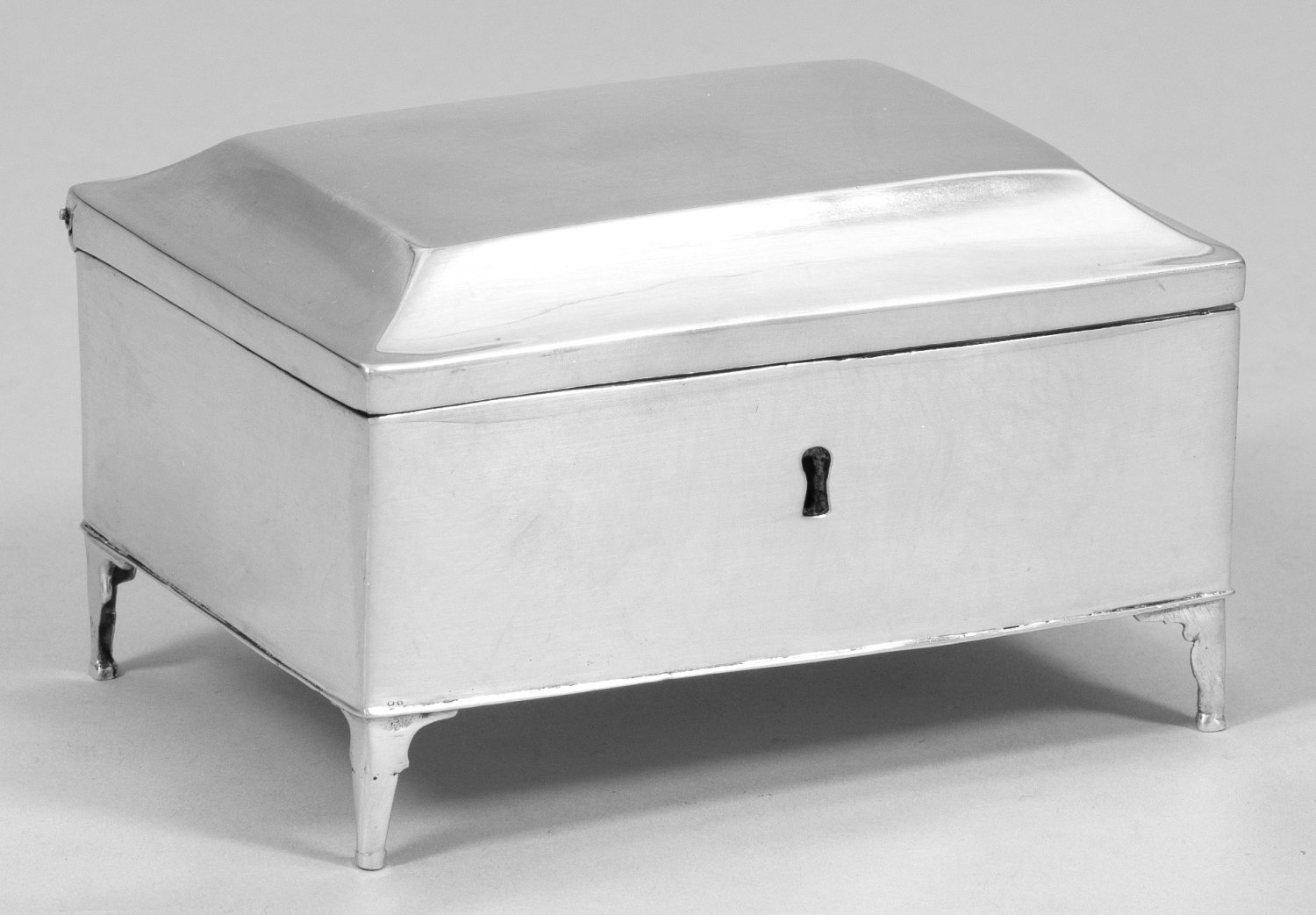 Silber. Von vier schmalen Füßen getragener, rechteckiger, glatter Korpus. Scharnierter, mittig sanft ansteigender Deckel. Schauseitiges Schlüsselloch. Schlüssel fehlt. Gest., Tremolierstrich, Beschauzeichen, Meister aus der Silberschmiedefamilie Müller. Gew. ca. 340 g. H. 7,3 cm. 12,3 cm x 8,5 cm.