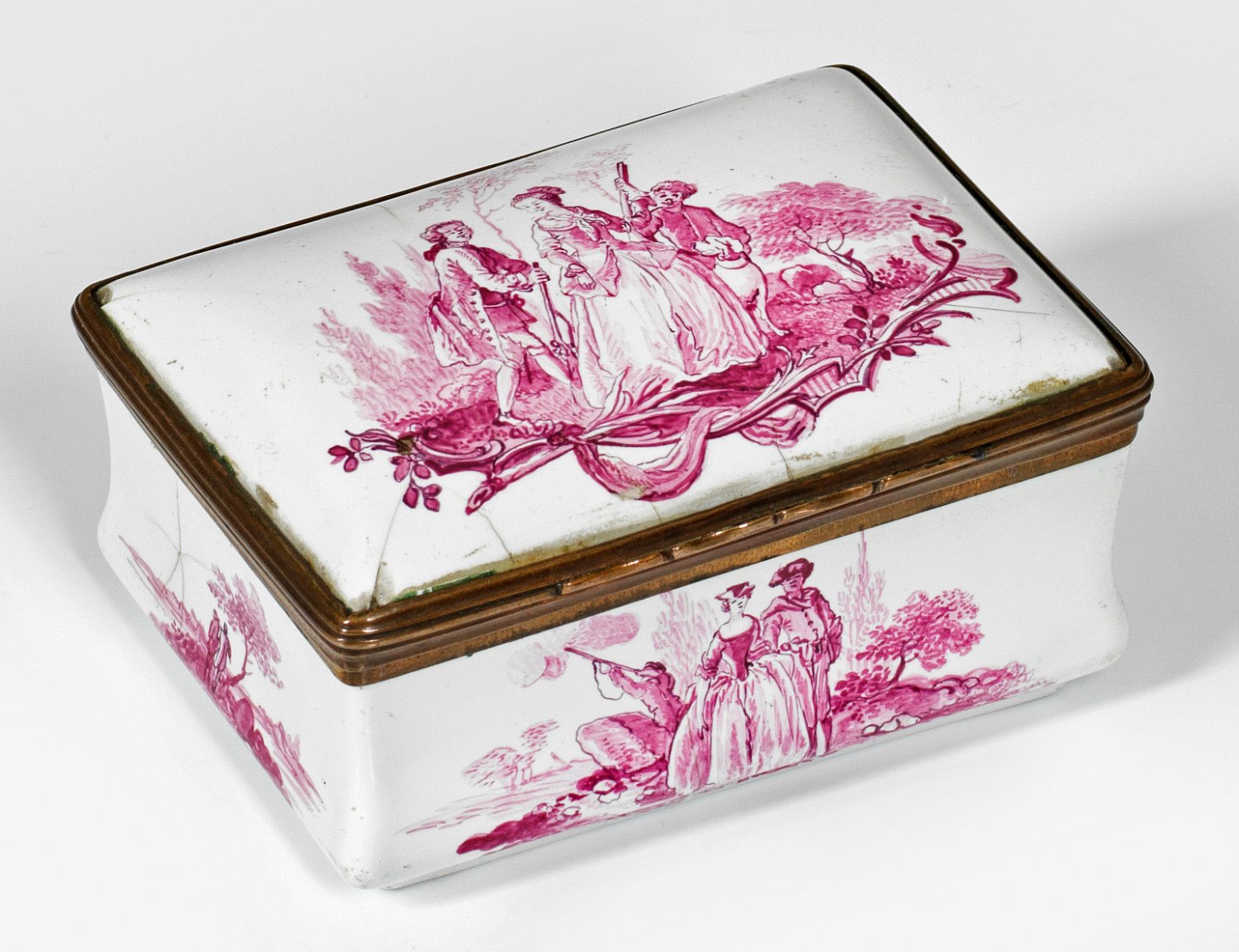Kupfer, weiß emailliert. Rechteckige Form mit gering eingezogener Wandung und mehrfach profilierter Kupfermontierung. Gering gehöhter Scharnierdeckel, Wandung, Bodenunterseite sowie Deckelinnenseite mit galanten, szenischen Darstellungen von Jagdgesellschaften und Landschaftsansichten in purpurfarbener Camaieumalerei. Innen altes Inventar-Etikett. Best.; H. 4 cm. 8,3 cm x 6 cm.