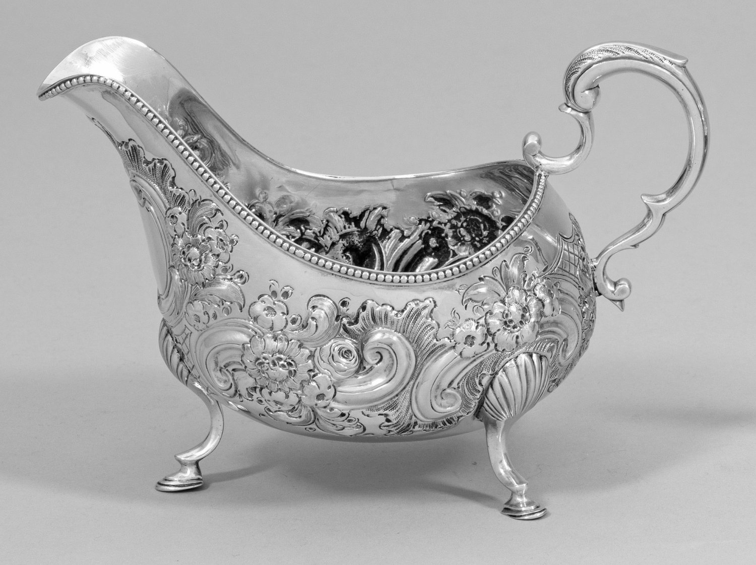 Sterlingsilber. Von drei hufähnlichen Füßen mit muschelförmigem Ansatz getragener, gebauchter, schiffchenförmiger Korpus mit profiliertem, von Perlband umzogenem Rand. Glatte Wandung verziert mit üppigem, stark reliefplastischem Dekor aus Voluten, Rocaillen, C-Schwüngen und Blüten. Hoher, sich verjüngender Ausguss. Unterhalb des hochgezogenen Ausgusses ein freies Ovalmedaillon. Volutierter Ohrenhenkel. Rest.; Gest., Beschaumarken, Meister Matthew West (tätig ab 1765), Jahresbuchstabe "P". Gew. ca. 270 g. H. 12,5 cm. 19 cm x 10 cm.