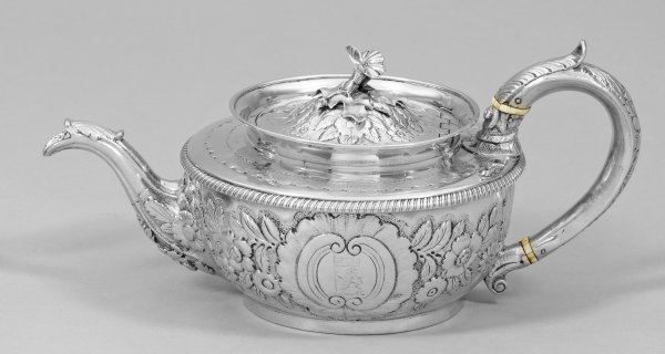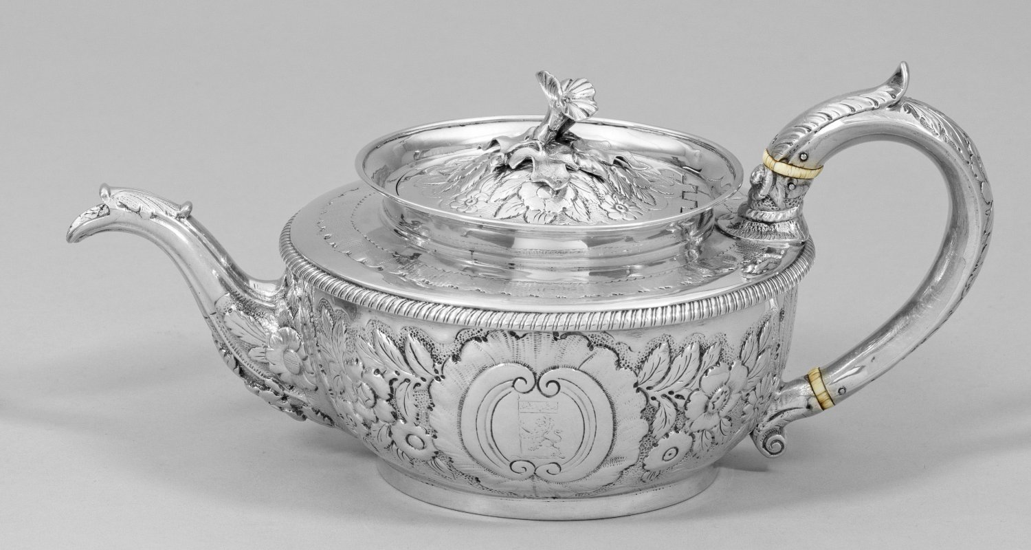 Sterlingsilber. Auf zylindrischem Stand, gedrückt bauchiger Korpus mit stark abgesetzter Schulter in ausgestelltem Rand endend. Gering aufgewölbter Scharnierdeckel mit vollplastisch gearbeitetem Knauf in Form eines Blütenzweiges. Korpus, Ausguss und Ohrenhenkel mit umlaufend stark reliefplastischem Blütendekor über punziertem Grund verziert. Auf den Seiten je ein von C-Schwüngen und Rocaillen gefasstes, undeutlich graviertes Wappen. Gest., Beschaumarken, Meister Paul Storr (tätig ab 1792), Jahresbuchstabe "G". Gew. ca. 820 g. H. 12,5 cm.
