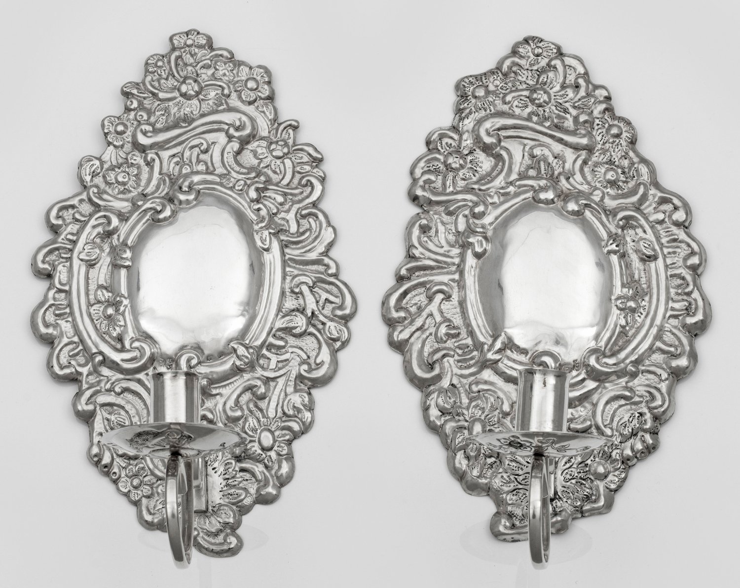 Silber. 1-flg.; Passig geschweiftes, von hochreliefplastischen Rocaillen und Blüten gerahmtes Wandschild mit konvex gewölbtem, ovalem Spiegel. Herausnehmbarer Leuchterarm mit zylindrischer Tülle und leicht gemuldeter Traufschale. Gest., Beschauzeichen, Beschaumeisterzeichen "E", Meister Emmanuel I Ellerholtz (wird Meister 1758), preußischer Steuerstempel. Gew. zus. ca. 685 g. 29,5 cm x 17 cm.