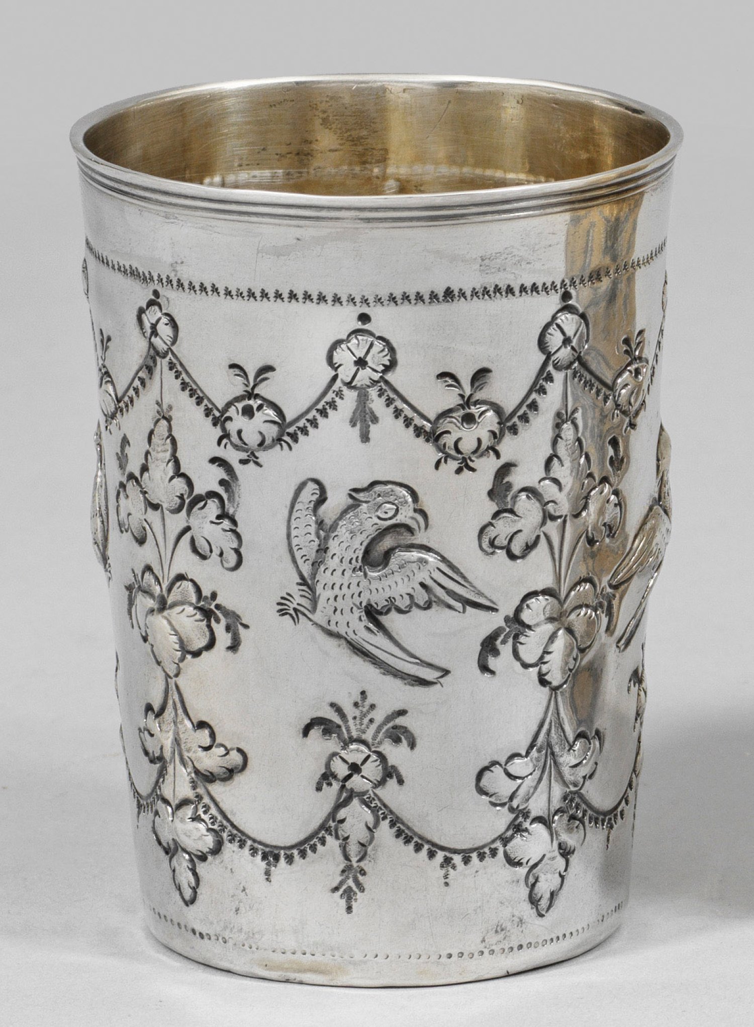 Silber. Gering konisch, mit schmalem Lippenrand. Umlaufend reliefierte Festons mit Blättern und Blüten sowie fliegende Vögel. Innen vergoldet. Gest. 84, Stadtmarke mit Dat., wohl Beschaumeister Alexej J. Wichljajew. Gew. ca. 90 g. H. 8,7 cm.