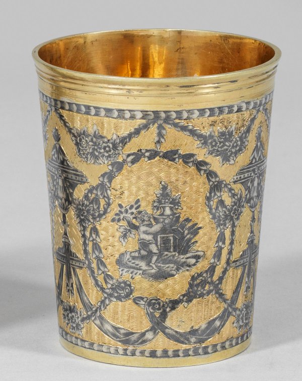 Silber, vergoldet und geschwärzt in sog. Niello-Technik. Gering konisch, mit schmalem Lippenrand und abgesetzter mehrfach profilierter Randzone. Umlaufende Ovalkartuschen mit Putti, flankiert von Kratervasen und üppigen Blatt- und Blütenfestons sowie fein drapierten Stoffbahnen. Die Wandung flächendeckend fein ornamental guillochiert, mit unterschiedlichen Feldern aus wellenförmigen, korbähnlich geflochtenen, geraden und halbrund überlappenden Linienzügen. Gest., undeutliche Beschaumarke mit Dat., unbekannter Beschaumeister und Meister. Gew. ca.140 g. H. 8,5 cm.