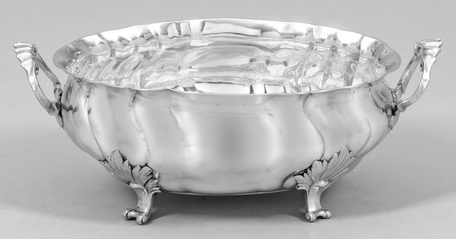 Silber. Von eingerollten Füßen, am Ansatz mit zart reliefiertem Blattwerk getragener, gebauchter, ovoider Korpus. Vierfach von vertikalen, wellenförmig geschweiften Zügen gegliederte Wandung mit gering eingeschnürter Schulter und ausgestellter Randzone. Seitliche, schmal gefächerte Volutenhenkel. Gest., Beschauzeichen, Meister Christian Benjamin Jeserich (wird Meister 1752). Gew. ca. 465 g. H. 9 cm. 24 cm x 14 cm.