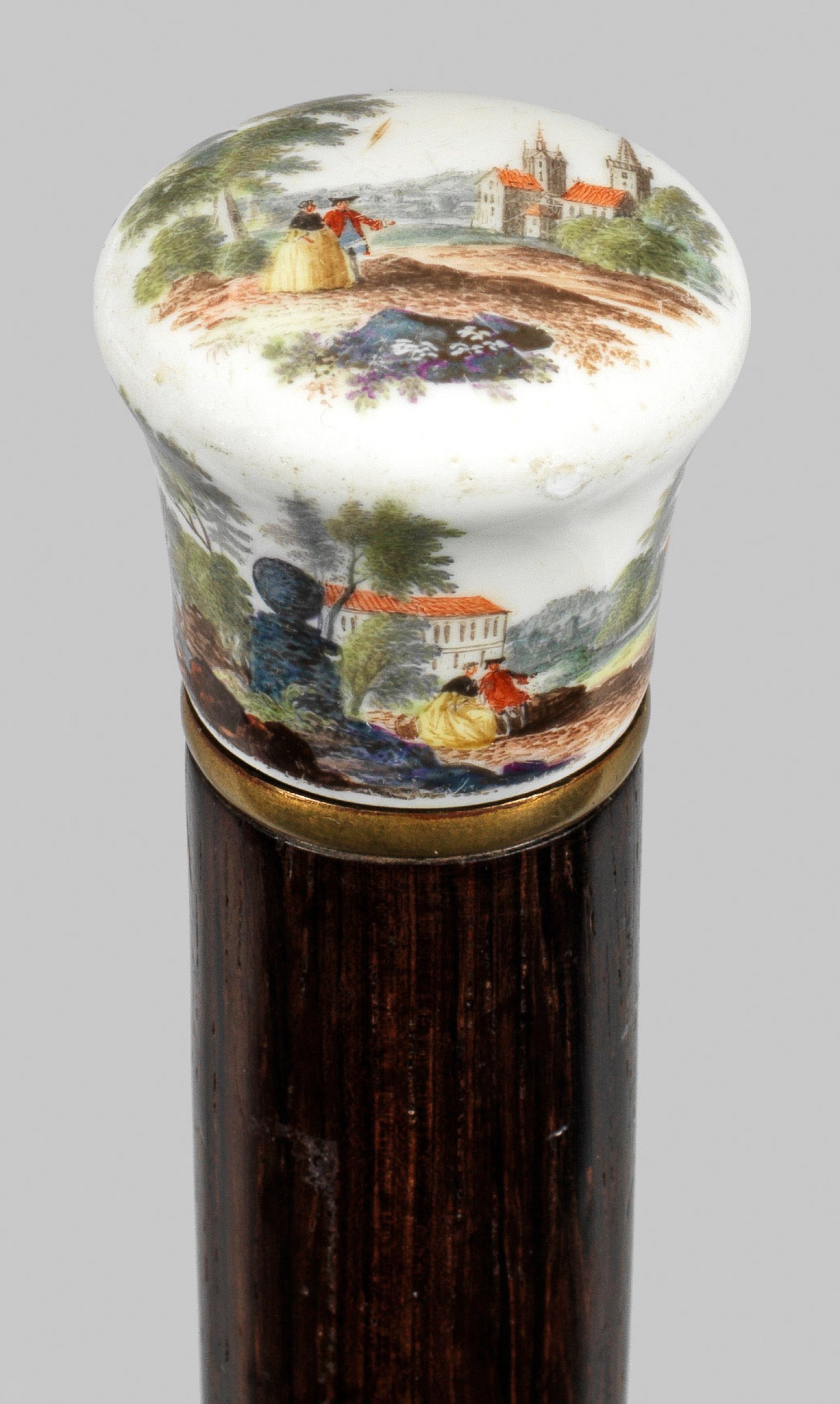 Konisch ansteigende Knaufform mit rundem Querschnitt. Umlaufend auf der Wandung und auf der Knaufoberseite Landschaftsszene an Flussufern mit imposanter Architektur und Watteaufiguren. Feine, polychrome Malerei, wohl von Christian Friedrich Kühnel. Stock aus Palisander mit Messingmontierung sowie eine, von Perlmutterring eingefasste Durchbohrung für Lederriemen oder Band, um 1900. Knauf-H. 3 cm. Ges.- L. 92 cm.