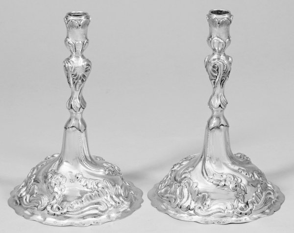 A pair of Wroclaw Rococo silver candlesticks by Johann Ernst Braungart (master since 1754). Assay and master´s mark, date letter "G". Tax mark.