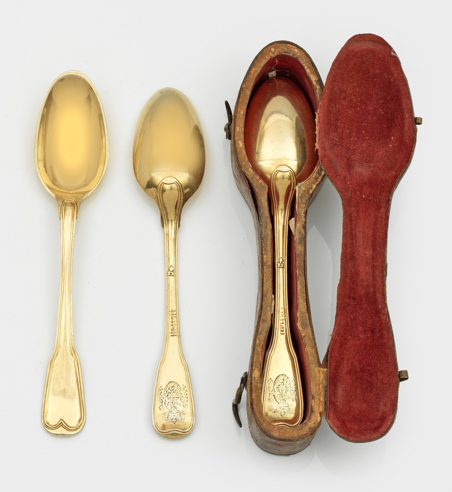 Six French Louis XVI gilt silver tea spoons in original leather case by Jakob Heinrich Alberti (master since 1764). Engraved noble coat of arms. Assay mark and 13 lot, master´s mark