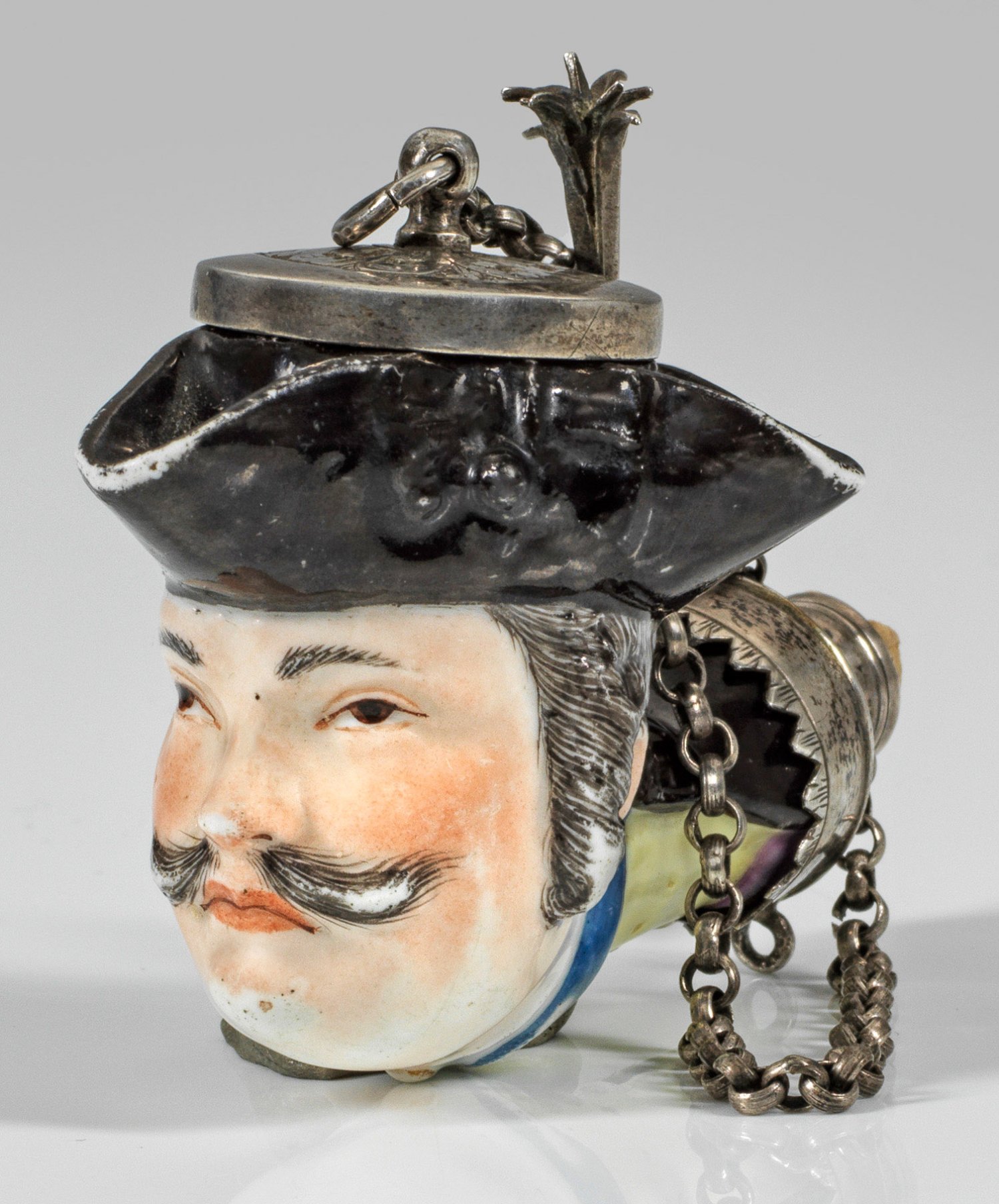 in Gestalt eines Männerkopfes mit röhrenförmigem Pfeifenhals. Vollplastische Darstellung eines schnurrbärtigen Parforcejägers in gelb-blauer, sächsischer Parforce-Livree. Das fein gestrichelte Haar mit seitlichen Locken ist geschmückt mit einer schwarzen Zopfschleife sowie bedeckt von einem schwarzen Dreizack. Polychrome Malerei mit Goldakzenten. Entw. Johann Joachim Kaendler. Gravierte Silbermontierung. Oberhalb abnehmbarer, durchbrochen gearbeiteter Deckel an Verbindungskette. Ber.; H. 6 cm (mit Montierung).
