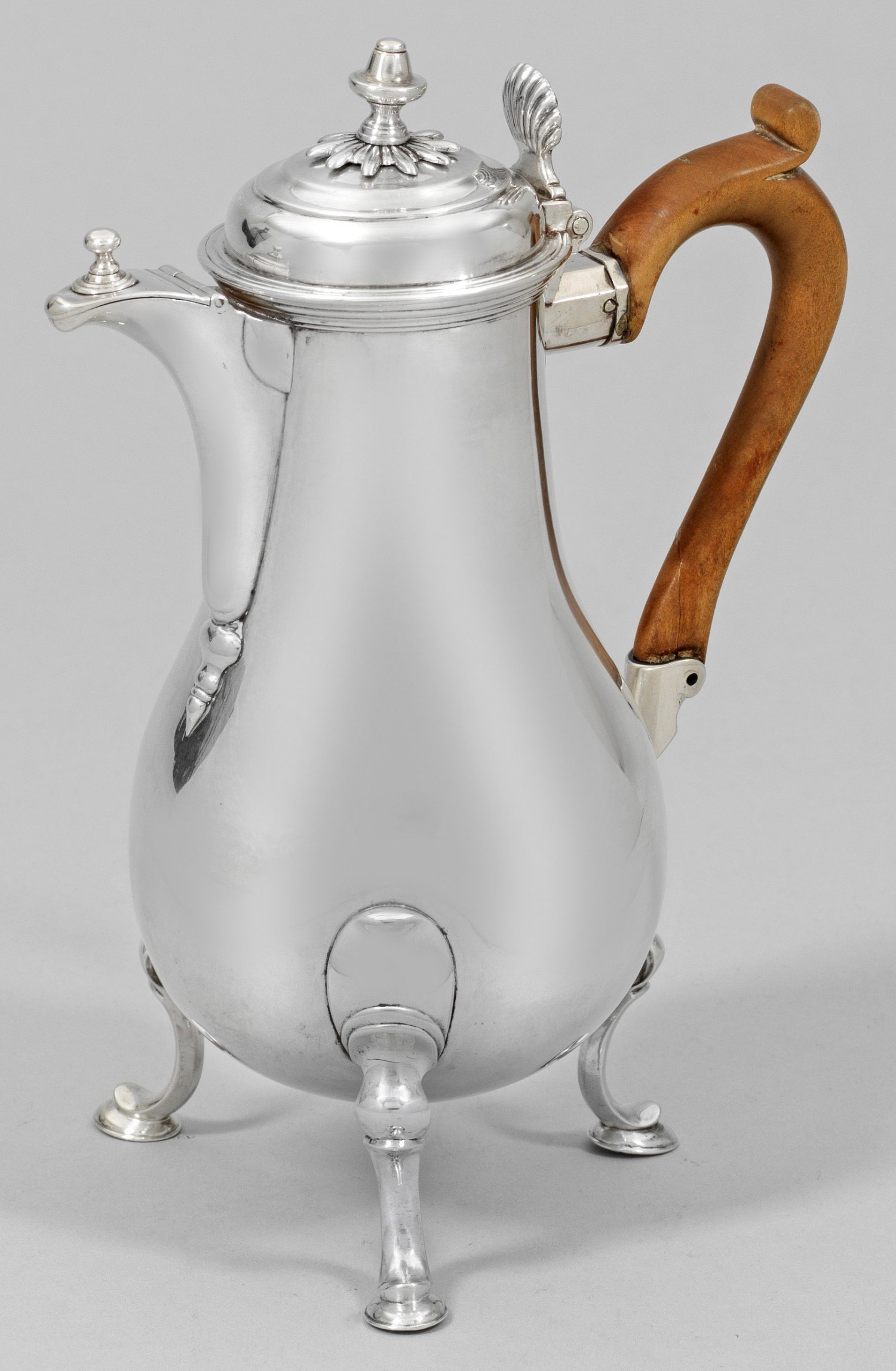Silber. Über drei stilisierten Huffüßen mit hochgezogenen, aus gegenständlichen C-Schwüngen geformten Beinen birnförmiger, glatter Korpus mit mehrfach profiliertem, schmalem Rand. Leicht aufgewölbter, gestufter Scharnierdeckel mit kleinem Balusterknauf über sternförmiger Rosette und Drücker in Form einer Muschel. Mittig angesetzter Konsolausguss ebenfalls mit scharniertem Deckel und Balusterknauf. Seitlich ohrenförmiger Henkel aus Holz. Schauseitig graviertes, ligiertes Monogramm "MJK" (?). Gest., Beschauzeichen, Meister wohl Jean Redard (tätig ab ca. 1750). Gew. ca. 210 g. H. 14 cm.