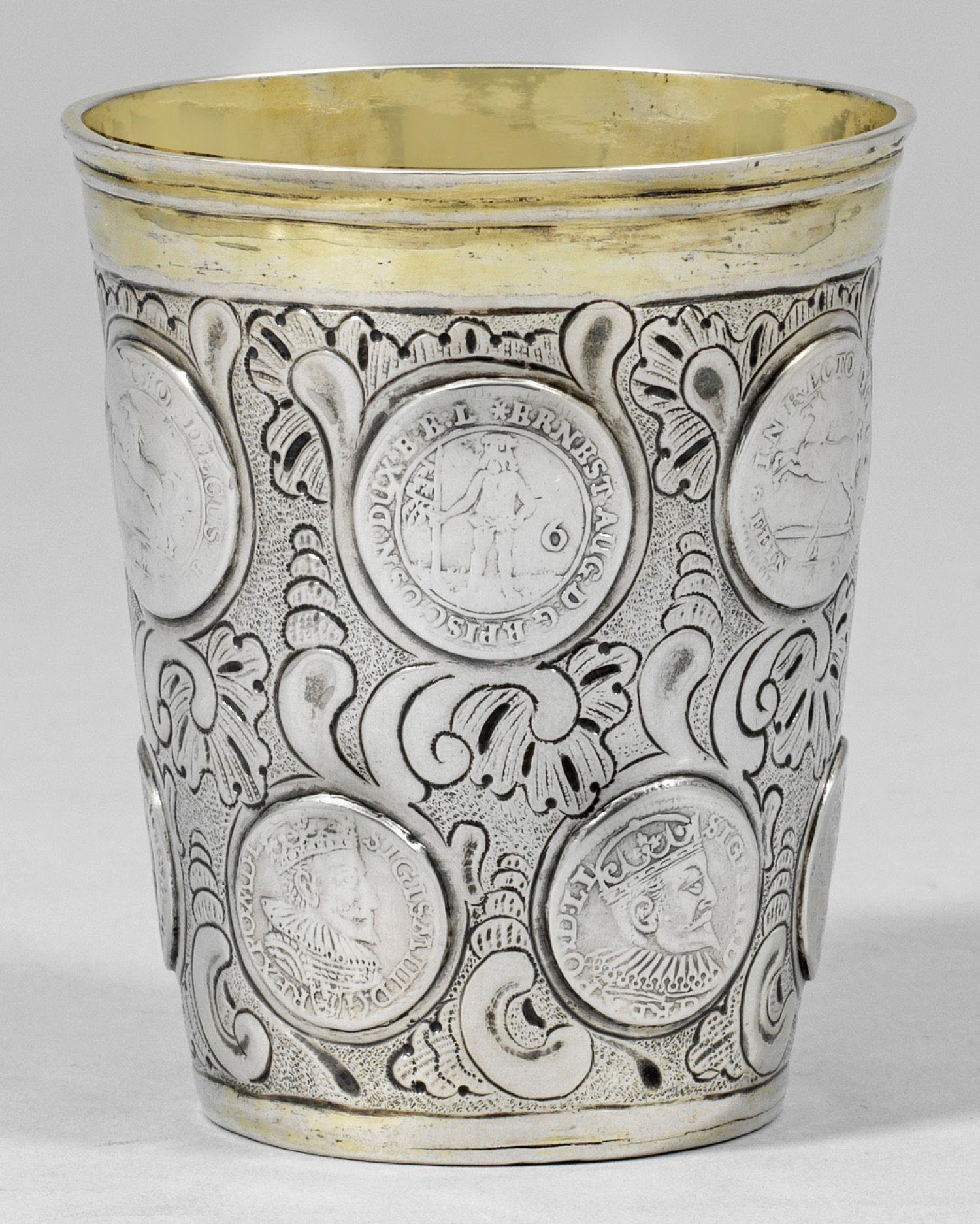 Silber, teilw. vergoldet. Konischer Korpus mit gering ausgestelltem Lippenrand über glatter, durch schmale Profillinien abgesetzter Randzone. Wandung flächendeckend verziert mit reliefierten Voluten und Rocaillen über fein punziertem Grund sowie zweireihig versetzt besetzt mit insgesamt 12 Münzen. In der oberen Reihe sechs sog. 6-Mariengroschen, Braunschweig-Lüneburg u. a. von 1669 und 1707. Die untere Reihe bestehend aus sechs Münzen des Königreichs Polen mit u. a. einem sog. Dreigröscher von 1595. Im Boden ein 1/4 Taler, Brandenburg-Preußen von 1622 mit Profildarstellung Herzog Georg Wilhelms I. von Preußen (1619 - 1640). Innen vergoldet. Gest., Tremolierstrich, Beschauzeichen, Meister Christian Leo (wird Meister 1734), Jahresbuchstabe "Y". Gew. ca. 130 g. H. 8,5 cm.