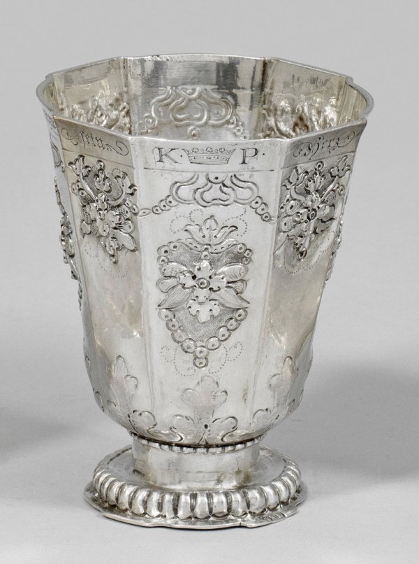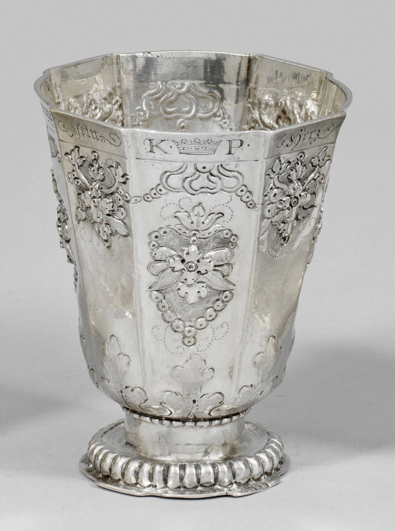 Silber. Von Godronen gerahmter, gedrückter Rundfuß, übergehend in kurzen, gekehlten Schaft. Am Ansatz gerundeter, von graviertem Blattkranz umzogener, konischer Korpus. Die Wandung durch vertikale Grate achtfach facettiert gegliedert und mit reliefplastischen Festons und Blütenbündeln verziert. Auf dem Rand spätere deutsche Widmung "Herz, gewissen, glas und wein Müssen pur und reine sein" mit bekröntem Monogramm "K. P." sowie " Geb. 20. Sept. 1883". Gest., Beschaumeister Michail Bobrowschtschikow, Meister Timofej Filippow Silujanow (Meister seit 1760). Gew. ca. 130 g. H. 9,5 cm.