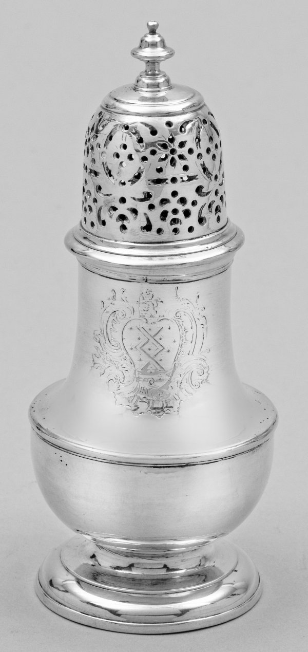 Sterlingsilber. Über rundem, aufgewölbt getrepptem Stand sich stark bauchig erweiternder, durch schmale Profilringe unterteilter Korpus. Glatte Wandung mit abgesetzter Schulter. Hoch aufgewölbter Streukopf, ornamentiert durchbrochen gearbeitet in Balusterknauf endend. Schauseitig graviertes Wappen, gerahmt von Rocaillen und C-Schwüngen. Gest., Beschaumarken, Meister Starling Wilford oder Samuel Welder (beide tätig um 1725), Jahresbuchstabe "N". Gew. ca. 190 g. H. 15,5 cm.