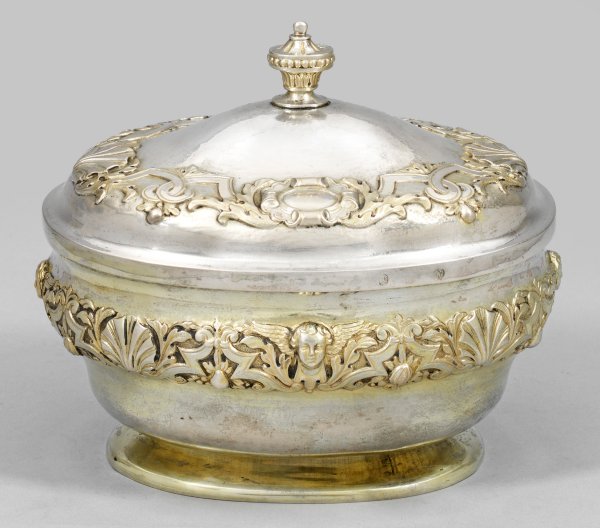 Silber, mit Restvergoldung. Gering aufgewölbter, ovaler Stand, übergehend in stufenweise gebaucht ansteigenden, glatten Korpus. Leicht bombierter Steckdeckel, zentral bekrönt von vasenförmigem Balusterknauf, verziert mit Perlfries und kurzen Kanneluren. Die Wandung umzogen von reliefplastisch getriebenem, breitem Band aus feinem Bandelwerk, Fruchtbündeln, Muschelwerk und Akanthusblättern. Die Längs- und Kurzseiten akzentuiert durch Cherubinen, über zart punziertem Grund. Der Deckel korrespondierend verziert mit einem breiten Akanthusblatt- und Bandelwerkband, die Längsseiten mittig mit querovalen Ovalkartuschen, die Kurzseiten mit großen Muscheldarstellungen verziert. Gest., Tremolierstrich, Beschauzeichen, Johann Daniel Albrecht (tätig ab ca. 1736). Gew. ca. 400 g. H. 15 cm. 17,3 cm x 13,3 cm.
