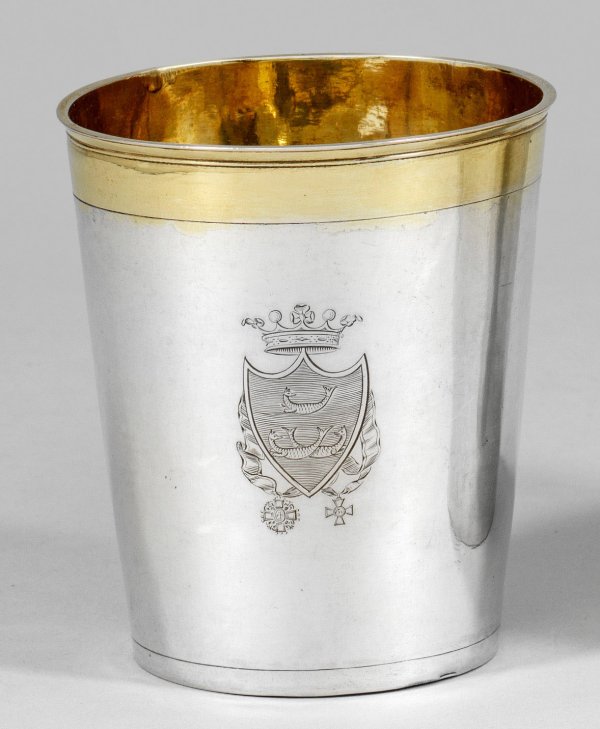Silber, teilw. vergoldet. Über flachem Stand sich konisch erweiternder, glatter Korpus mit ausgestelltem Lippenrand und durch schmale Profillinien abgesetzte Randzonen. Schauseitig graviertes Wappenschild mit drei fischgeschwänzten Kreaturen unter Adelskrone. Unterhalb behängt mit zwei stilisierten Orden. Innen vergoldet. Gest. Tremolierstrich, Beschauzeichen, Meister Jean Roman (wird Meister um 1737). Gew. ca. 130 g. H. 9,8 cm.