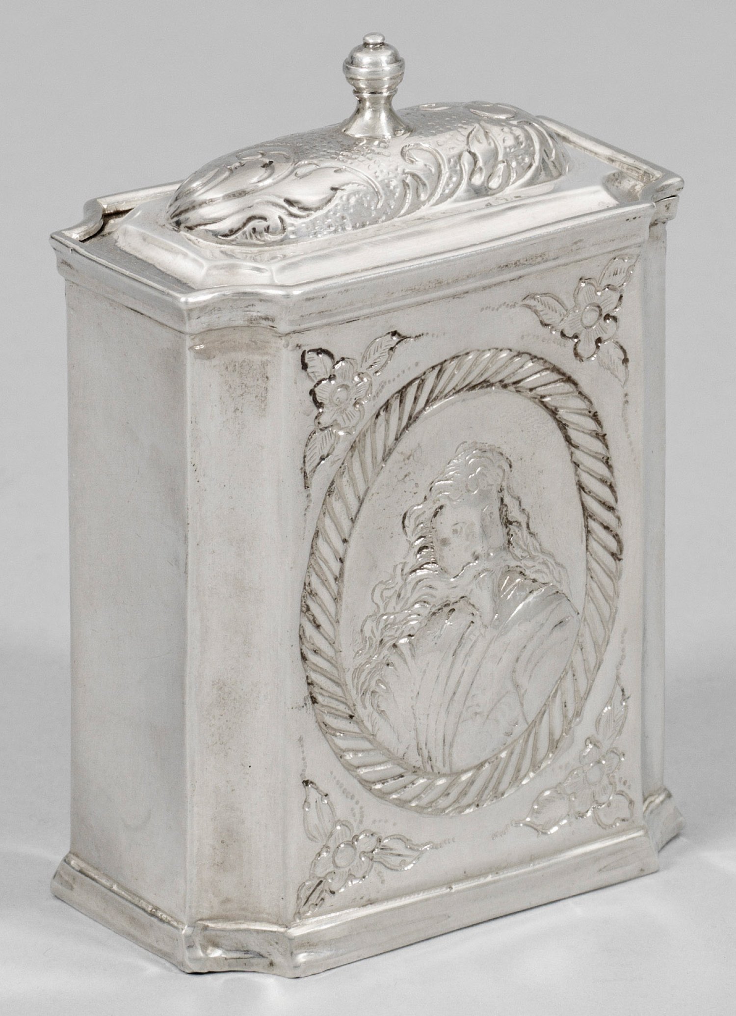Silber. Hochrechteckiger Korpus mit eingezogenen Ecken. Zentral aufgewölbter Schiebedeckel mit kleinem Balusterknauf und verziert mit Akanthusblättern. Auf der glatten Wandung vorder- und rückseitig reliefplastische Ovalmedaillons mit Damen- bzw. Herrenporträt, gerahmt von stilisiertem Kordelband und Blüten. Gest., Beschauzeichen, Meister Samuel I. Hoff (wird Meister um 1731). Gew. ca. 115 g. H. 9,5 cm. 6,5 cm x 3,3 cm.