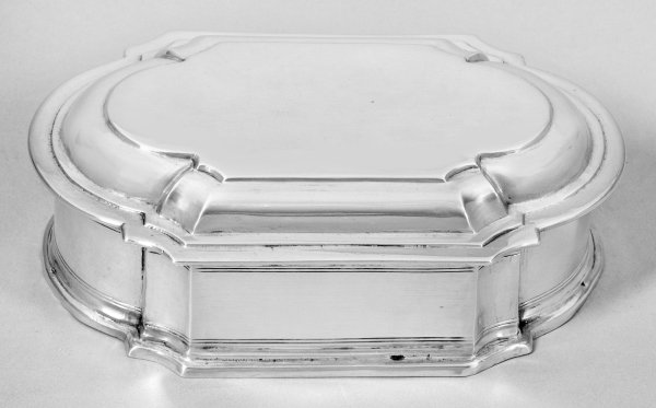 Silber. Rechteckiger Korpus mit gerundeten Kurzseiten. Flacher, profilierter Stand, übergehend in gerade, glatte Wandung mehrfach von feinen Profillinien gegliedert. Getreppt aufgewölbter Scharnierdeckel mit ausgestelltem Rand, in Profilwulst aufsteigend. Gest., Tremolierstrich, Beschauzeichen, Meister Sebald Spindler (wird Meister 1727). Gew. ca. 285 g. H. 4 cm. 13,5 cm x 8,5 cm.