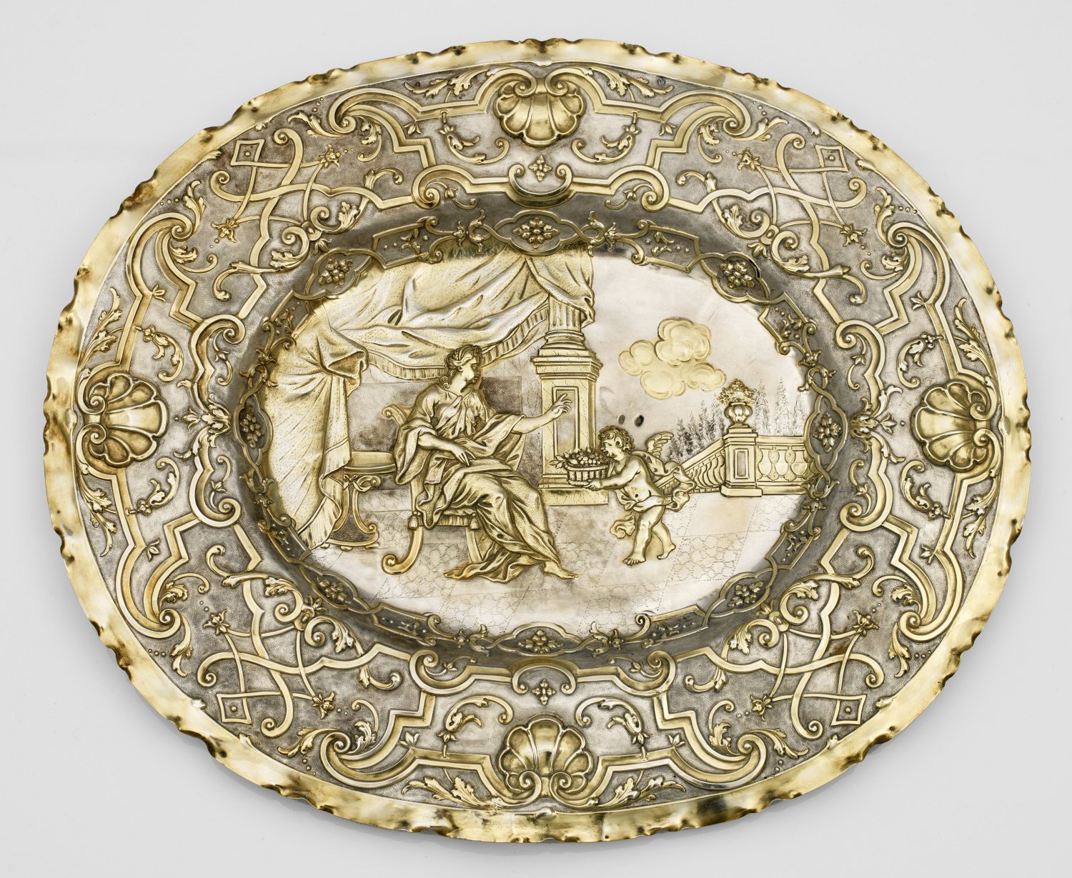 Silber, teilw. vergoldet. Ovaler, gering vertiefter Spiegel und breite, flache Fahne. Im Spiegel die szenische Darstellung eines Puttos, einer edlen, sitzenden Dame einen Blumenkorb überreichend. Im Hintergrund ein weiter, von einem Vorhang begrenzter Landschaftsausschnitt mit antikisierten Architekturelementen. Breite Fahne flächendeckend umzogen von reliefplastisch getriebenem Bandelwerk, mit Voluten- und Muscheldekor über äußerst fein punziertem Grund. Unregelmäßig, wellenförmig gekniffener, glatter Rand. Auf der Unterseite nummeriert "488". Gest., Beschauzeichen, Meister Johann Valentin Gevers (wird Meister 1700), Österreichische Repunzierung (1806-1807) und sog. Freistempel (1809-1810). Gew. ca. 690 g. 49 cm x 41,5 cm.