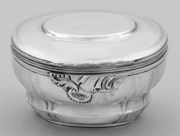 Silber. Ovaler, sich nach oben erweiternder Korpus mit scharniertem, gering gewölbtem Deckel. Schauseitig passig geschweifter, reliefplastischer Drücker verziert mit Rocaillen und C-Schwüngen. Wandung gegliedert von vertikalen, gekniffenen Zügen. Tabatiere einsetzbar in korrespondierend gestaltete Schale als Unterteil. Gest., Beschauzeichen, Meister Johann Daniel I Amende (wird Meister 1712), zweifache Repunzierung Österreich, Salzburg bis 1824. Gew. ca. 140 g. H. 5 cm. 8 cm x 6,5 cm.