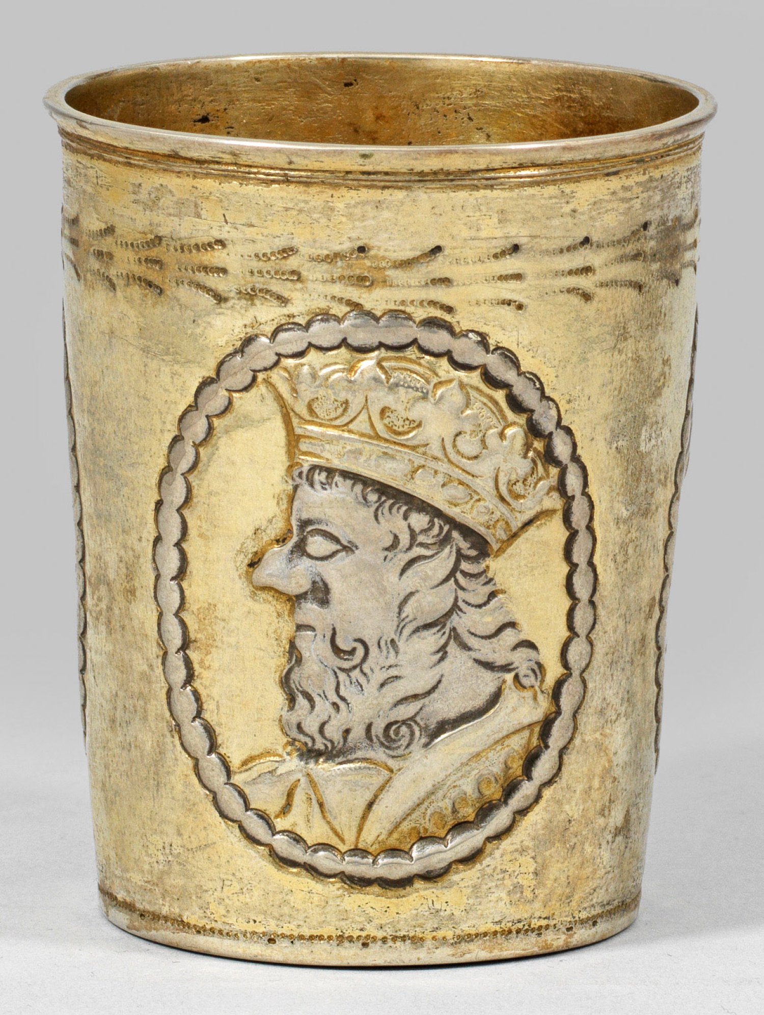 Silber, teilw. vergoldet. Über flachem Stand, gering konischer Korpus in ausgestelltem, von Profillinien umzogenen Lippenrand endend. Glatte Wandung unterteilt durch drei, von reliefiertem Perlfries gerahmte Ovalmedaillons mit hochreliefplastischen Porträtdarstellungen im Profil. Unter den Dargestellten ein römischer Feldherr, ein König sowie ein Porträt des römischen Kaisers Marcus Cocceius Nerva. Innen vergoldet. Gest., Tremolierstrich, Beschauzeichen, Meister Siegmund Wolfgang Preuss (wird Meister 1694). Gew. ca. 90 g. H. 8,6 cm.