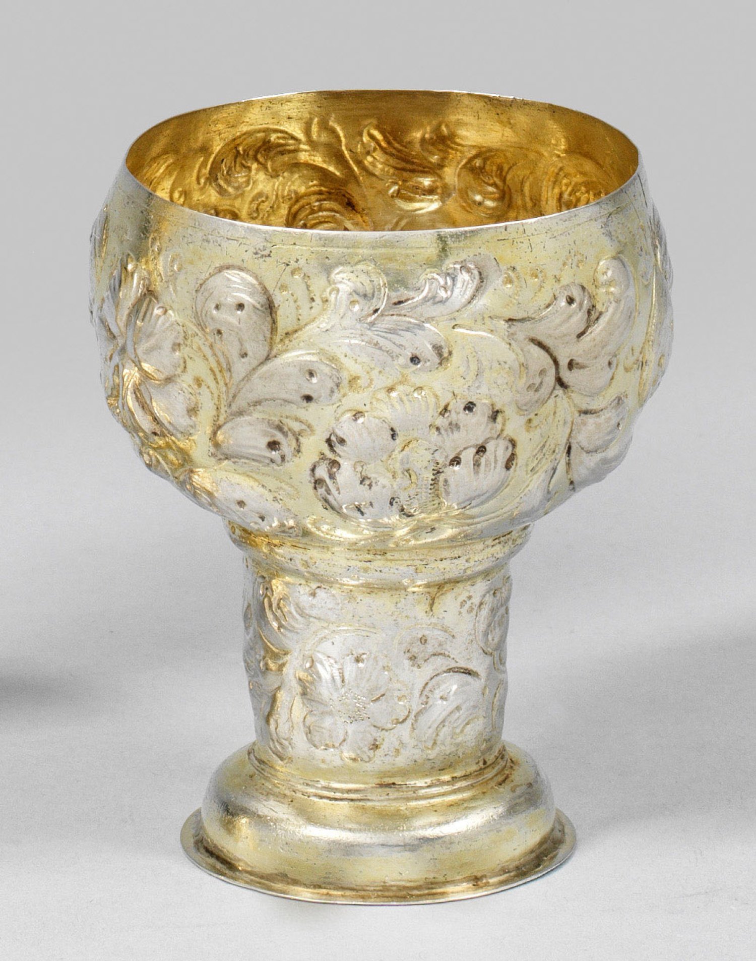 Silber, teilw. vergoldet. Gewölbter Rundstand mit flachem, ausgestelltem Standring. Über zylindrischem, zum Gefäßkörper gehörendem Schaft und gedrücktem, wulstähnlichem Nodus, bauchig ausschwingende Kuppa mit schmaler, glatter Randzone. Wandung und Schaft umzogen von fein getriebenem und punziertem Blattwerk, üppigen Barockblüten sowie Blattranken. Gest., Tremolierstrich, Beschauzeichen, Meister Thomas Ringler (wird Meister 1661). Gew. ca. 70 g. H. 9,3 cm.