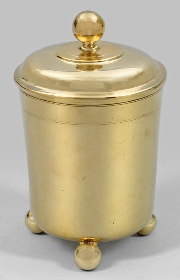 Silber, voll vergoldet. Zylindrischer, von drei ausgestellten Kugelfüßen getragener Korpus mit glatter Wandung, gering ausschwingendem Lippenrand und durch schmale Profillinien abgesetzter Randzone. Aufgewölbter Stülpdeckel mit zentralem Kugelknauf. Gest., Tremolierstrich, Beschauzeichen, Meister Johann Amende (wird Meister um 1681). Gew. ca. 310 g. H. 15,5 cm.